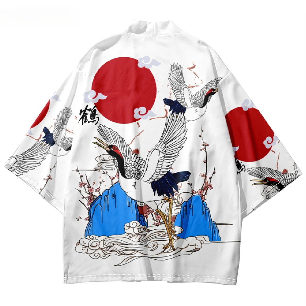 Women Men White Yukata Beach Haori Traditional Top Japanese Vintage Style Crane Print Kimono Cardigan Cosplay Shirt