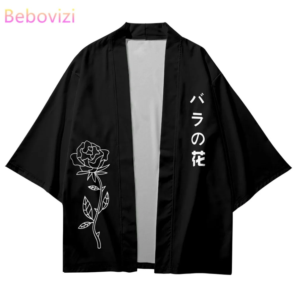 Traditional Kimono Men Women Yukata Cardigan Cosplay Haori Japanese Rose Flower Print Black Shirts Summer Clothing 5XL 6XL