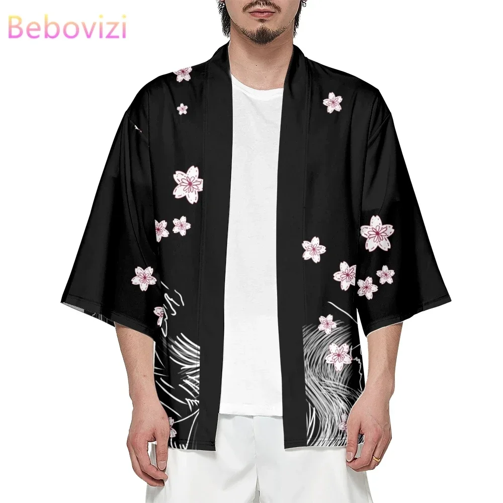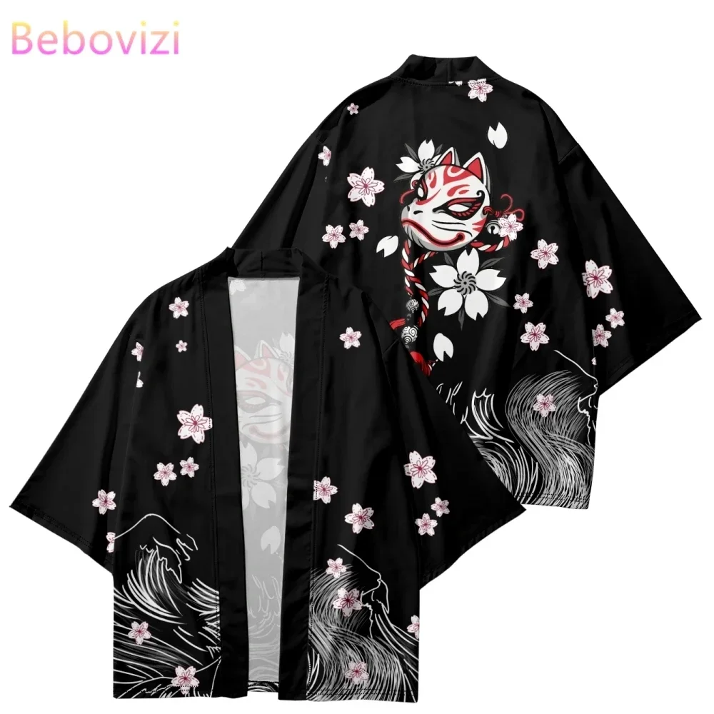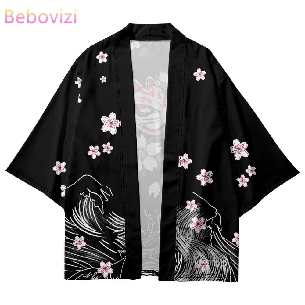 Traditional Clothing Black Yukata Japanese Anime Fox Print Kimono Streetwear Men Women Cardigan Robe