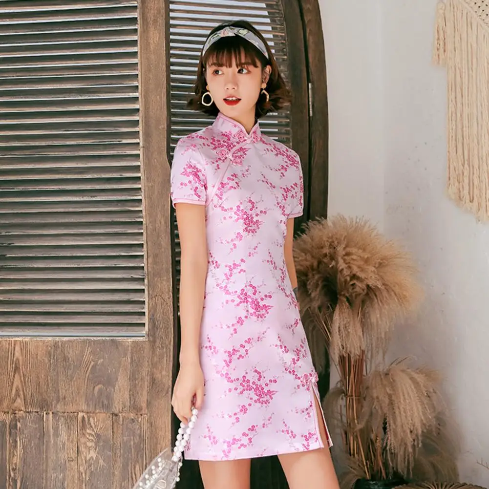 Mandarin Collar Short Sleeve Disc Buckles Side Split Hip Wrap Lady Cheongsam Elegant Flower Print Chinese Style Qipao Mini Dress