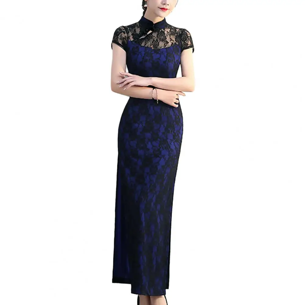 Name | Women Dress Chinese Style Vintage Lace Patchwork Stand Collar Short Sleeve Side Split Ankle Length Dress vestidos para mujer |