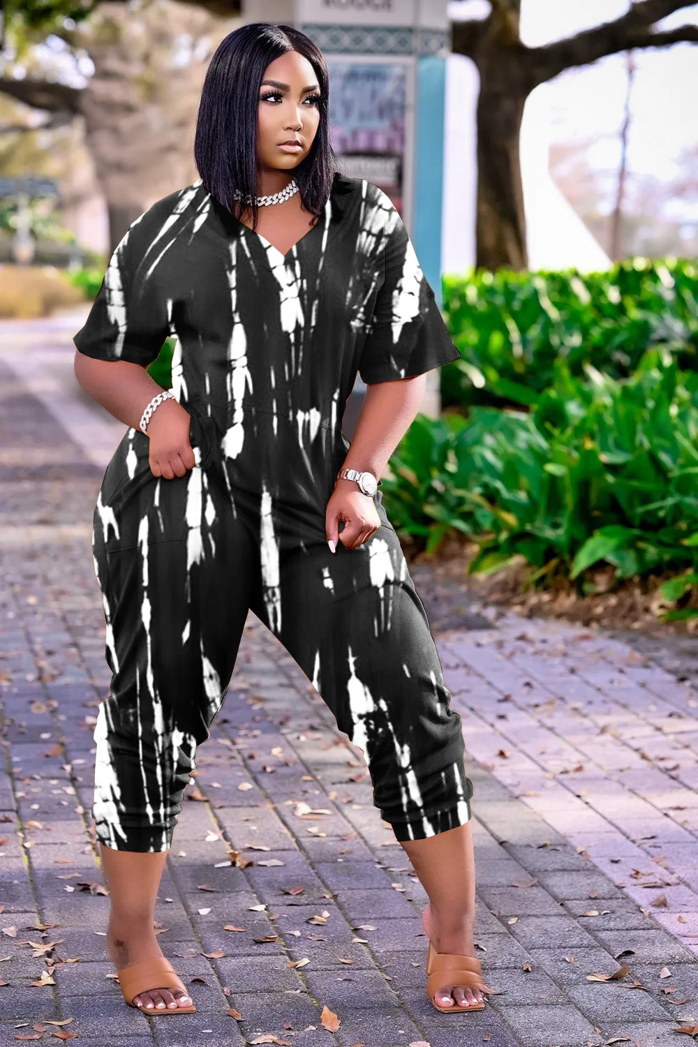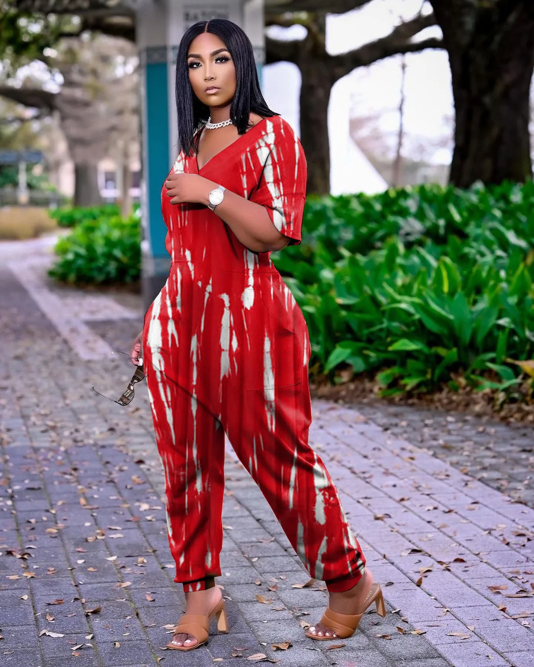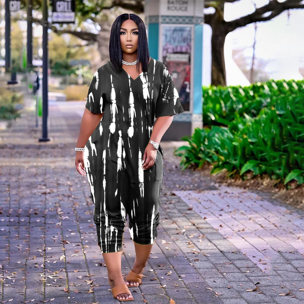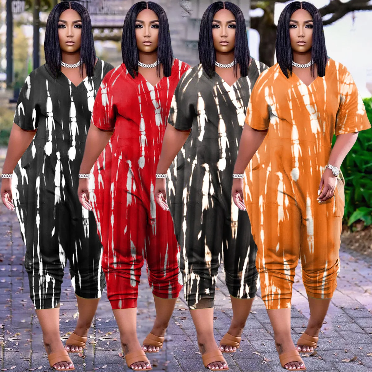 African Clothes for Women Autumn African Plus Size Short Sleeve V-neck Polyester Black Red Orange Jumpsuit Overalls for Women