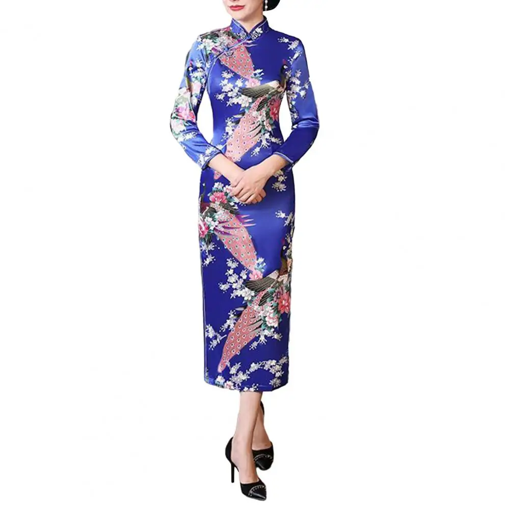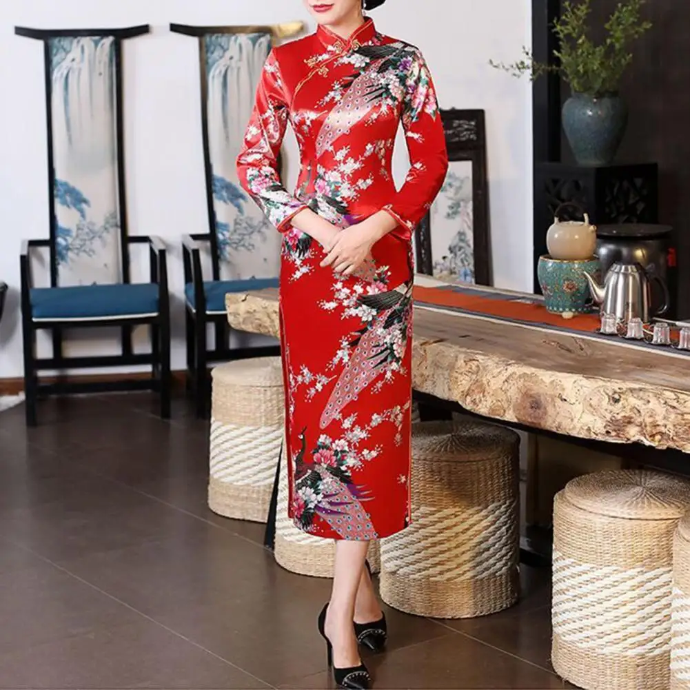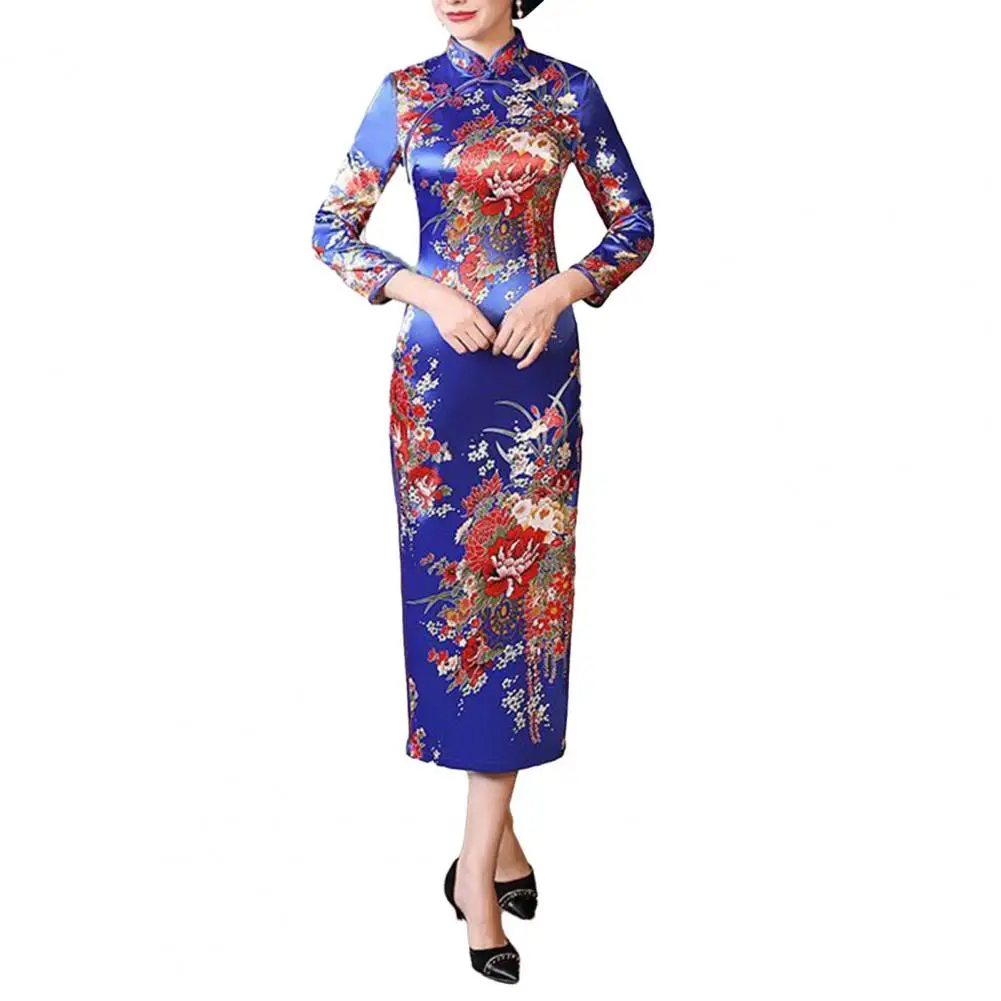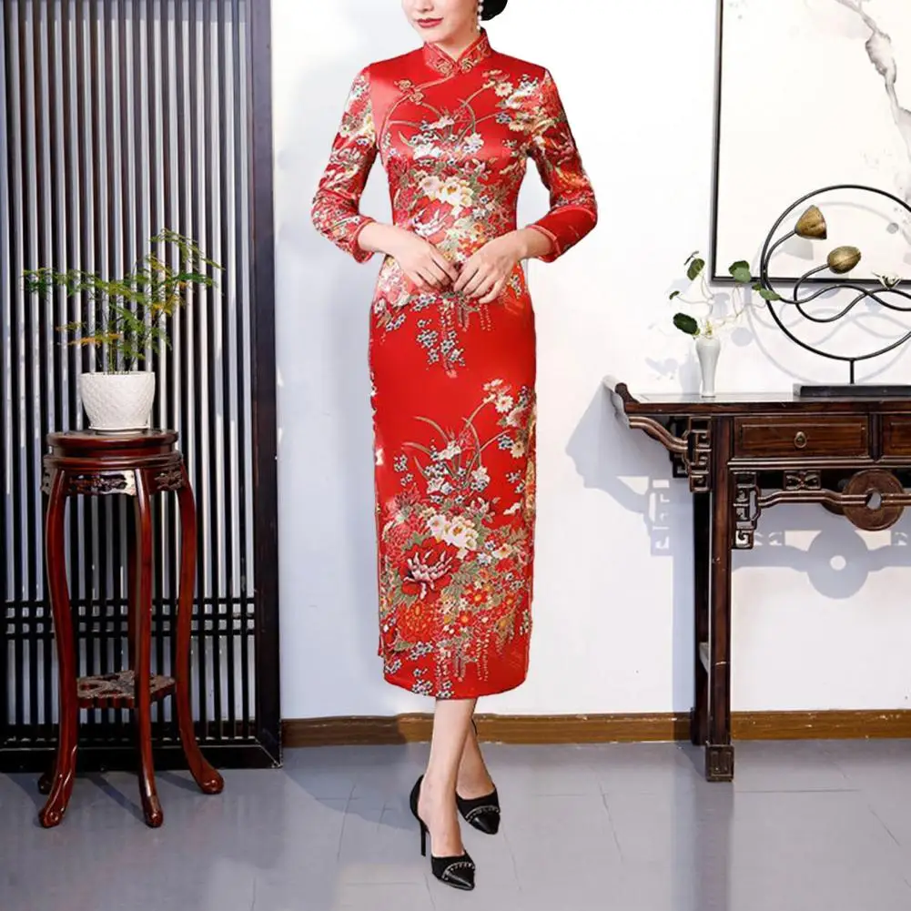 Name | Silky Slim Qipao Dress Chinese Style Floral Print Stand Collar Cheongsam 3/4 Sleeves High Side Split Chinese Knot Buttons Qipao |