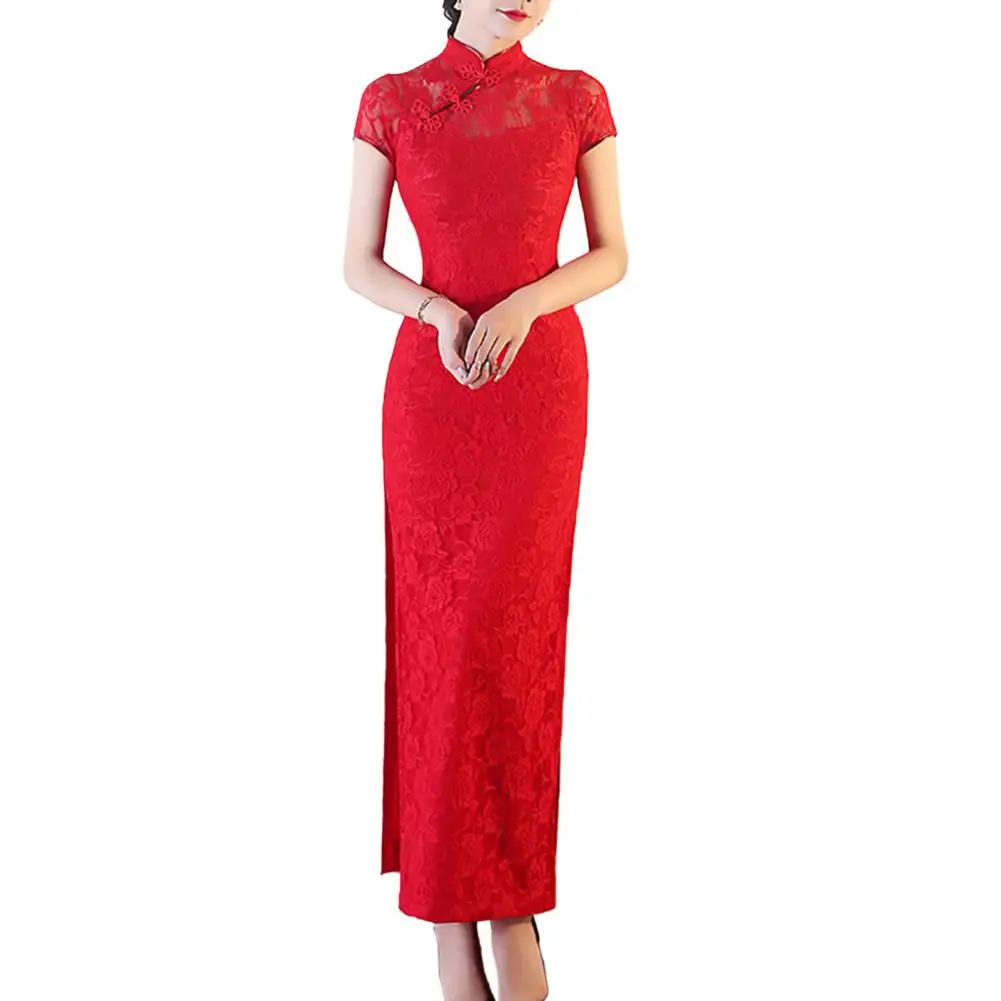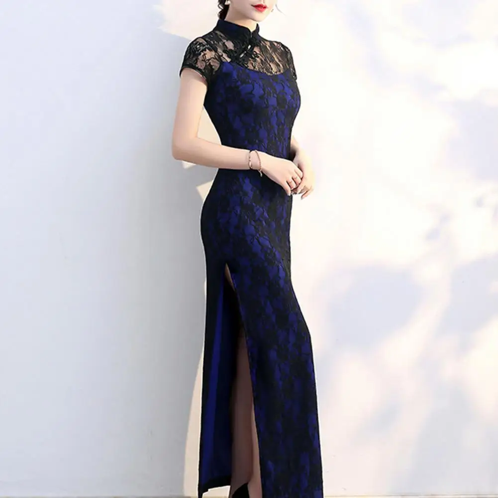 Short-sleeved Lace Cheongsam Elegant Vintage Chinese Lace Maxi Dress with Stand Collar Side Split Women's Classic for Chinese
