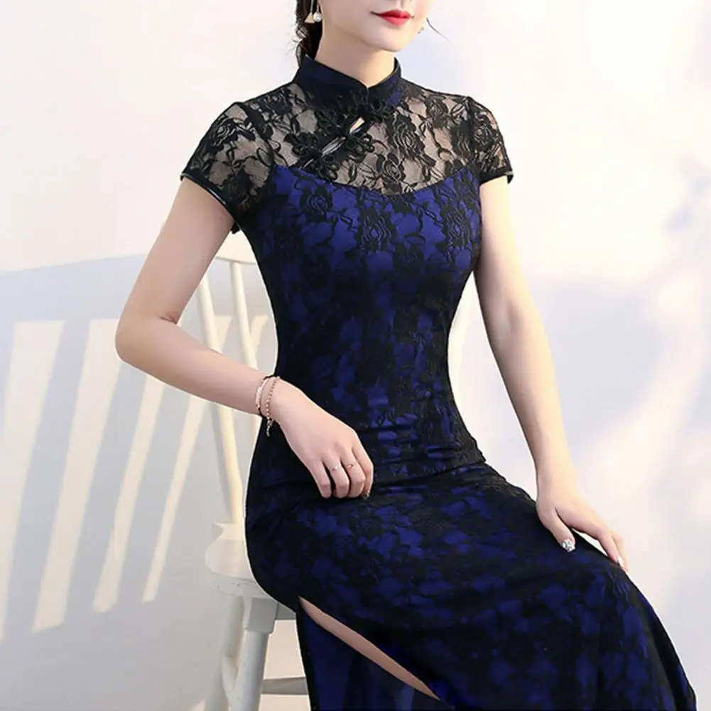 Comfortable Cheongsam Dress Elegant Vintage Chinese Lace Maxi Dress with Stand Collar Side Split Women's Classic for Chinese