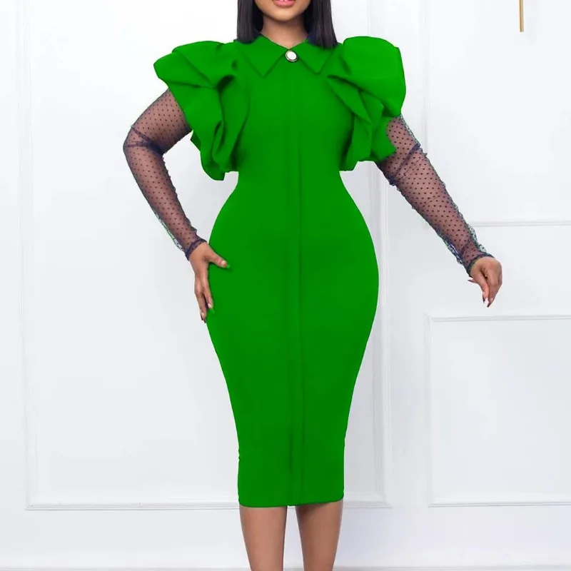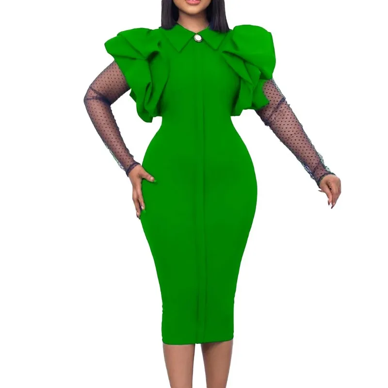 African Dresses for Women African Ruffles Patchwork Mesh Long Sleeve Elegant Office Ladies Work Wear Autumn Winter Midi Dress