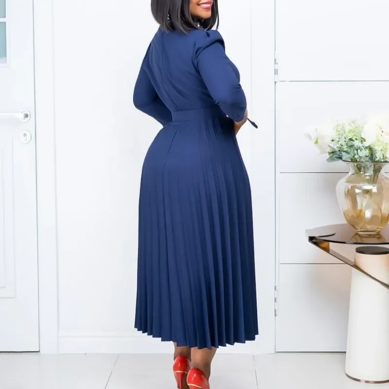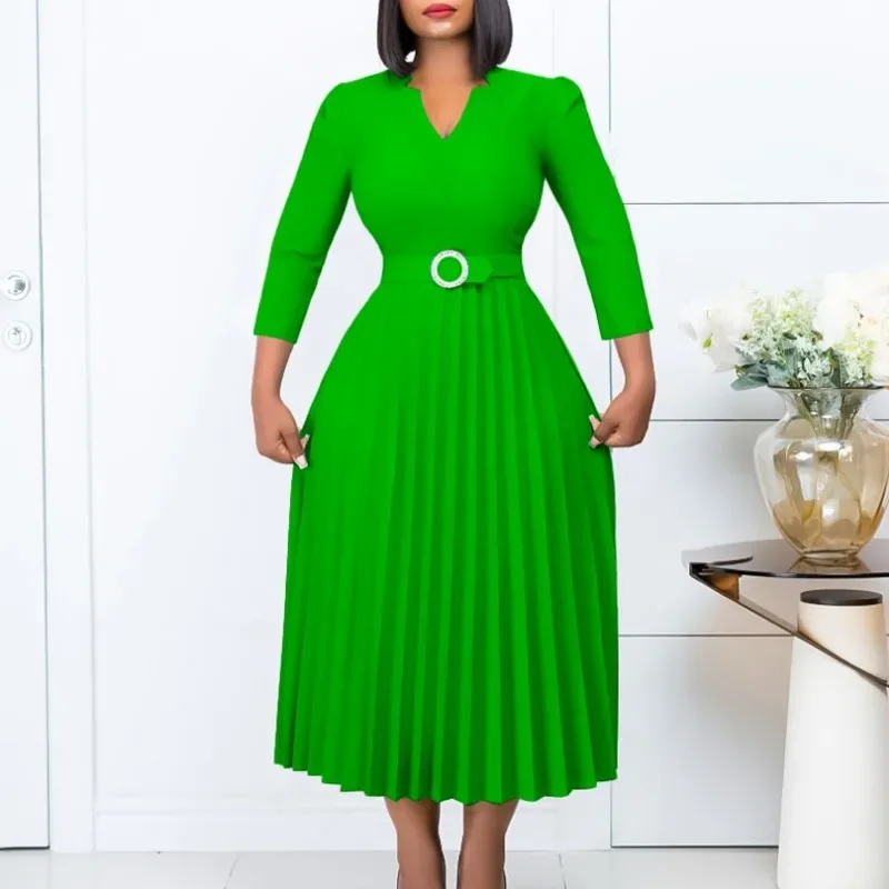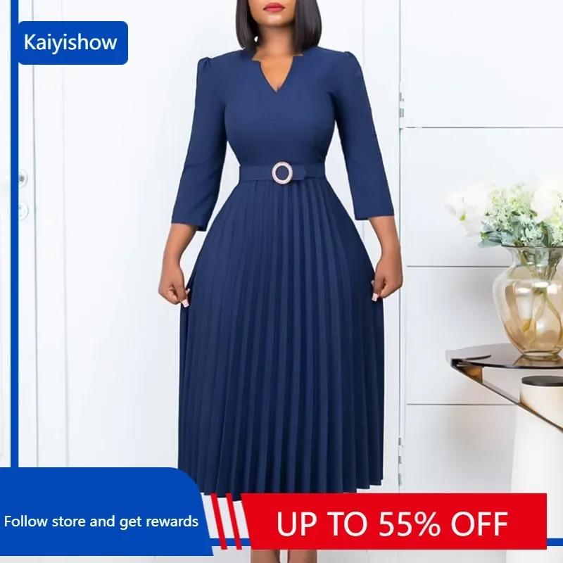 African Dresses for Women 2024 Summer Elegant African Office Ladies V-neck 3/4 Sleeve Pleated Dress Evening Party Robe with Belt