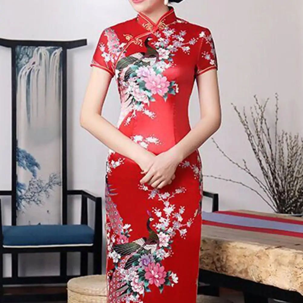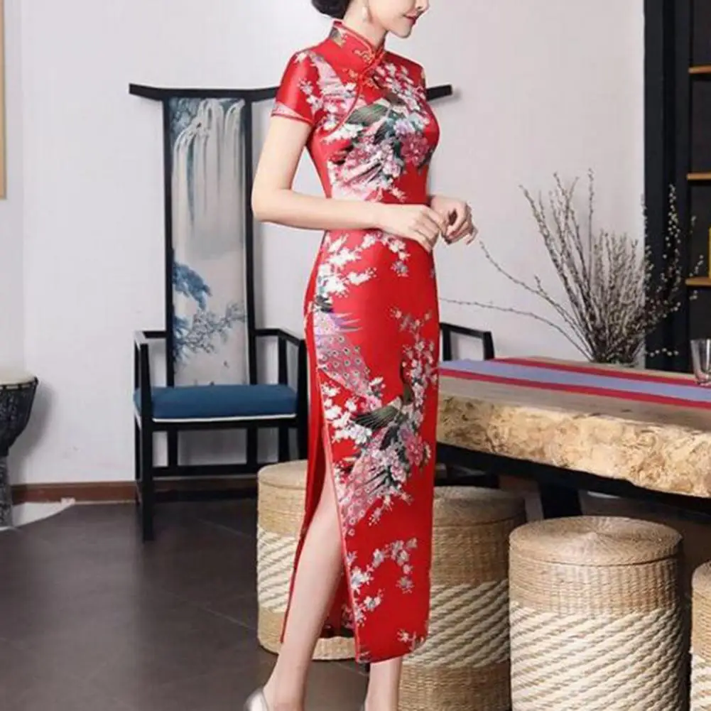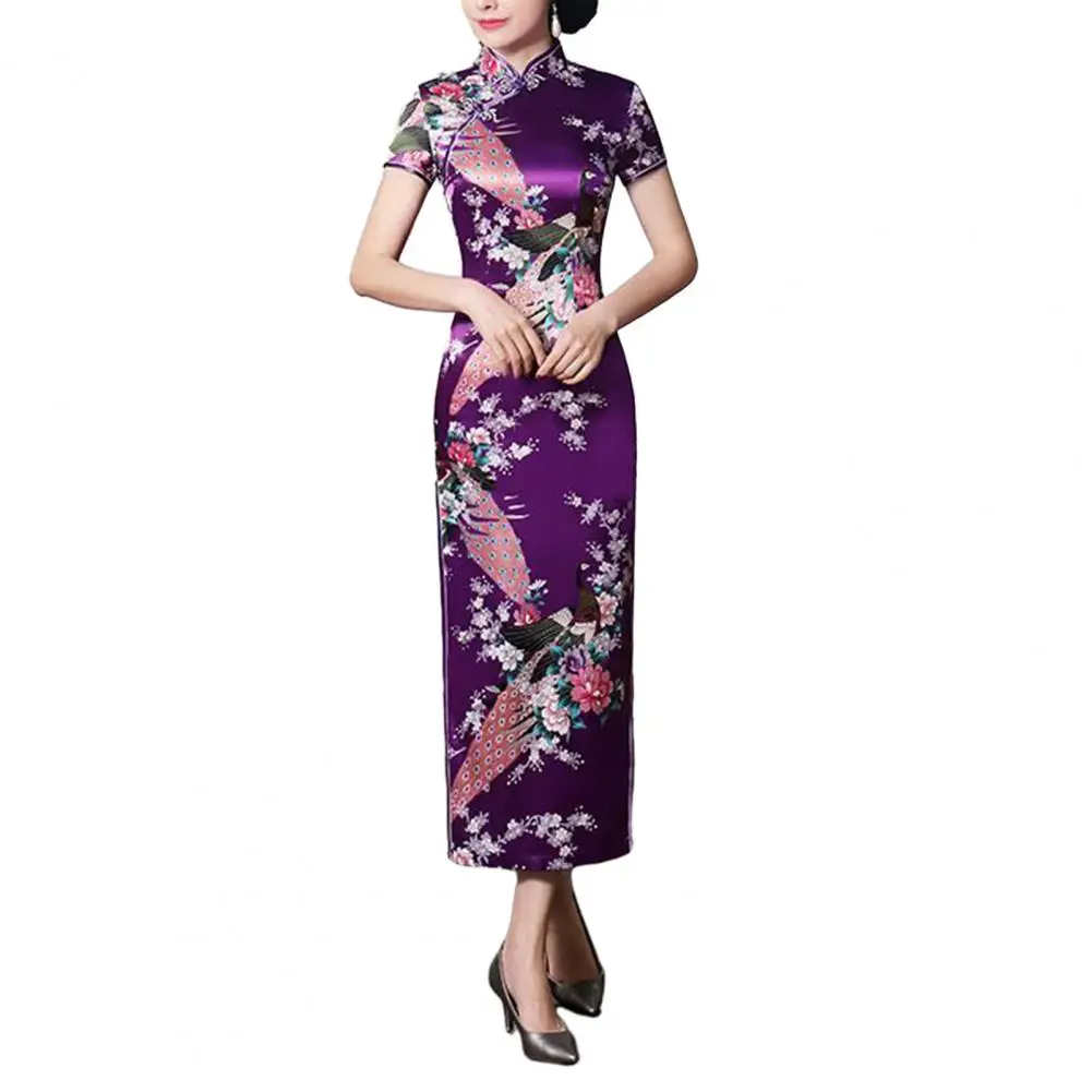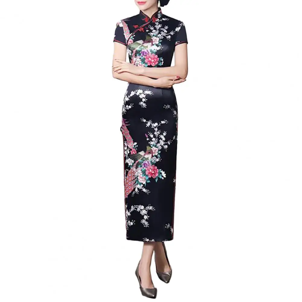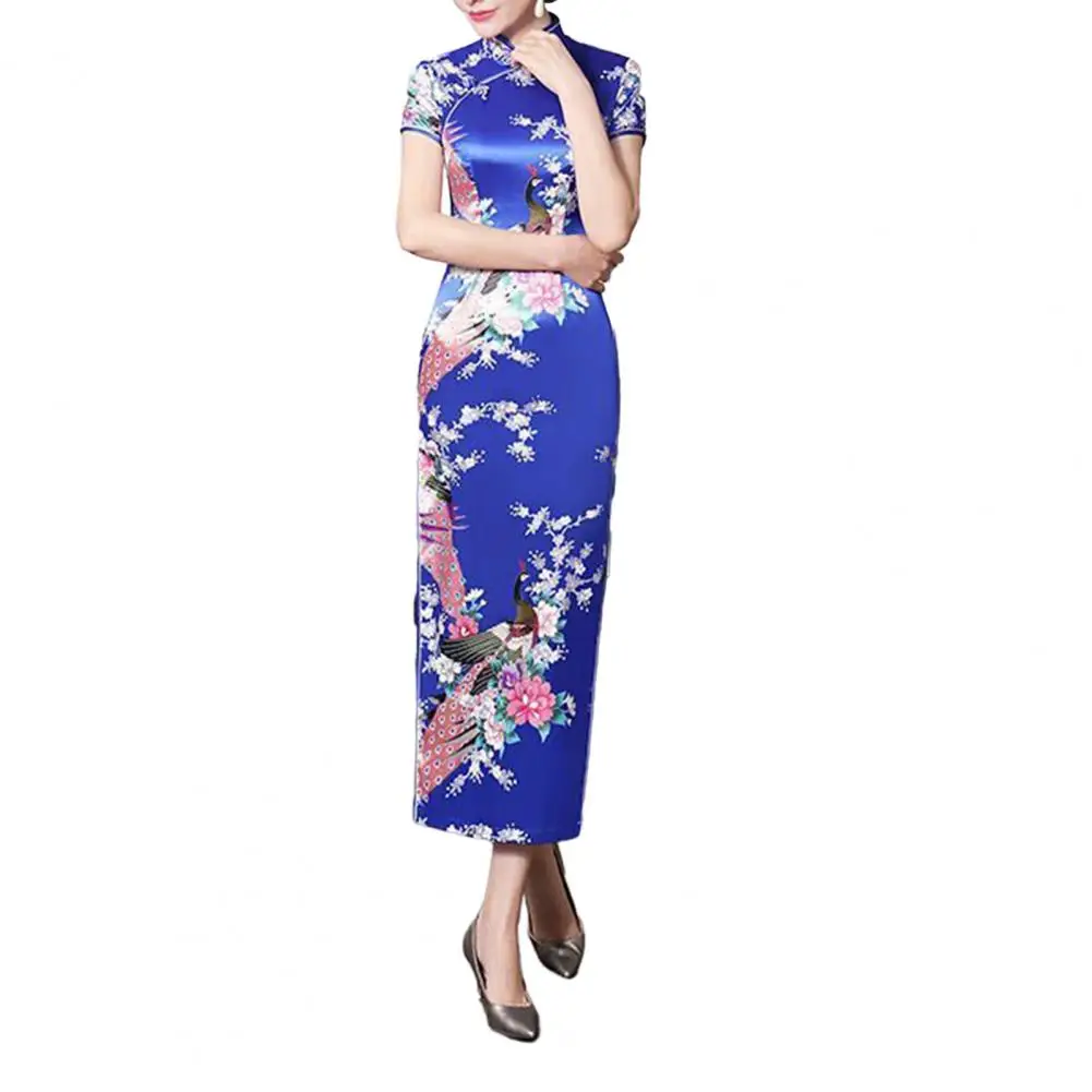 Name | Women Dress Chinese National Style Print Stand Collar Short Sleeves High Side Split Cheongsam Satin Silky Slim Qipao |