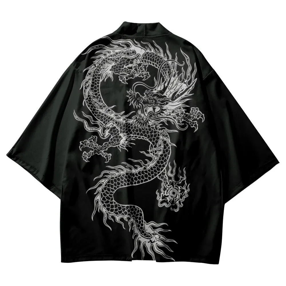 Black and White Drawing Cartoon Dragon Print Traditional Kimono Men Women Cosplay Cardigan Yukata Shirt Japanese Samurai Haori