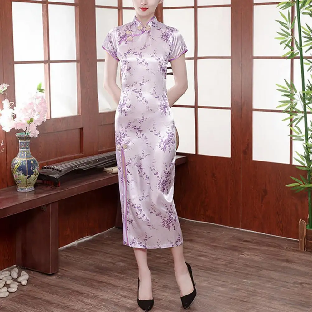 Name | Stand-up Collar Dress Elegant Faux Satin Long Cheongsam Chinese Style Stand Collar Short Sleeve Qipao Flower Print for Special |
