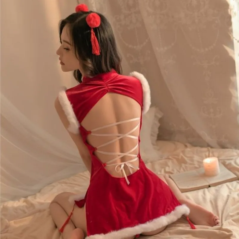 Name | Sexy Lingerie Velvet Christmas Party Red Dress Retro Qipao Uniform Expose Chest Backless Cheongsam Xmas New Year Cosplay Costume |