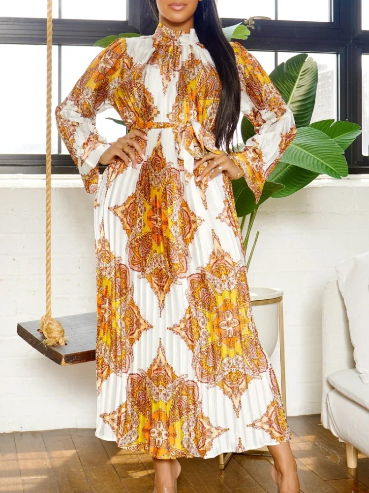 African Dresses for Women Autumn Elegant African Long Sleeve O-neck Print Pleat Long Robes Maxi Dress Dashiki African Clothing