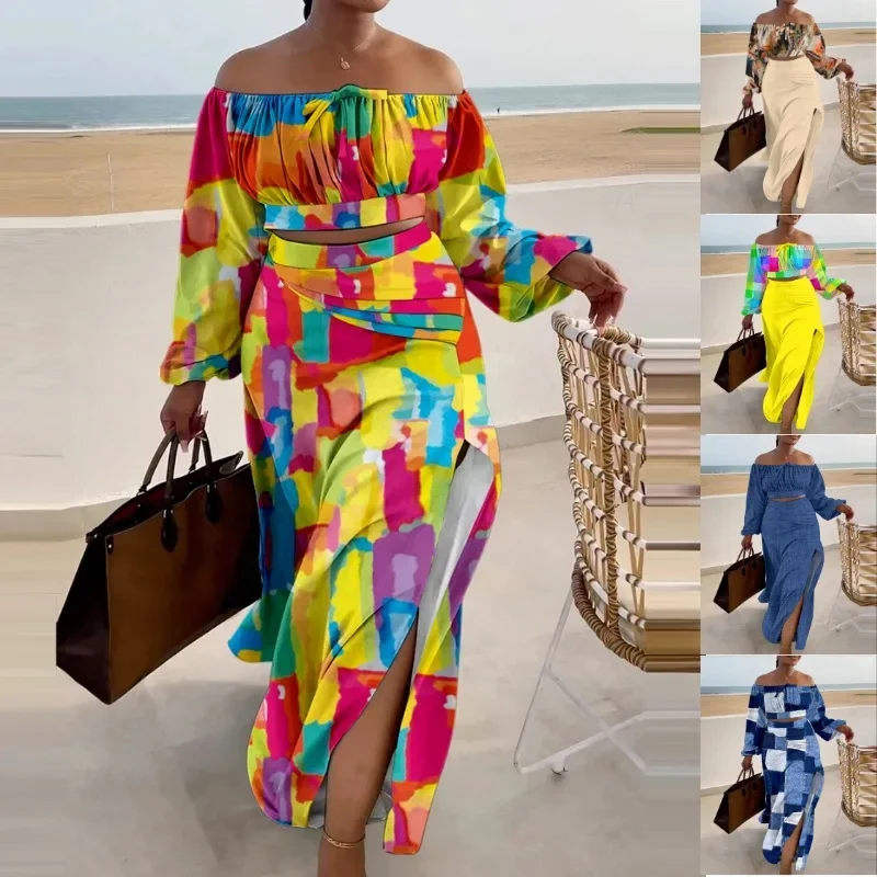African Clothes for Women Autumn African Long Sleeve Polyester Printing Two Pieces Top Long Skirts Matching Sets African Suit