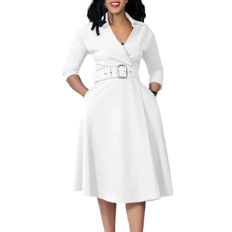 Spring Fashion Casual A-line Dress Women's turn down collar Long Sleeved Solid High Waist Elegant Dress Women