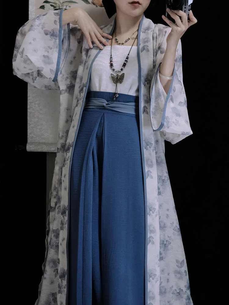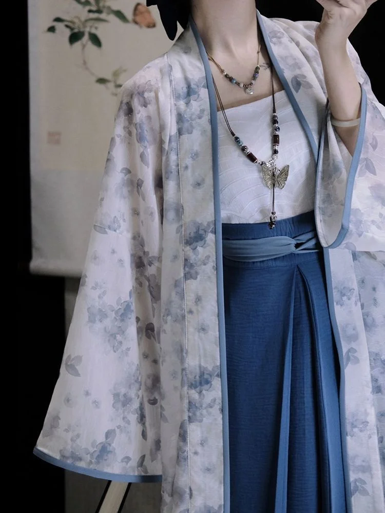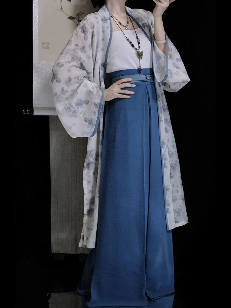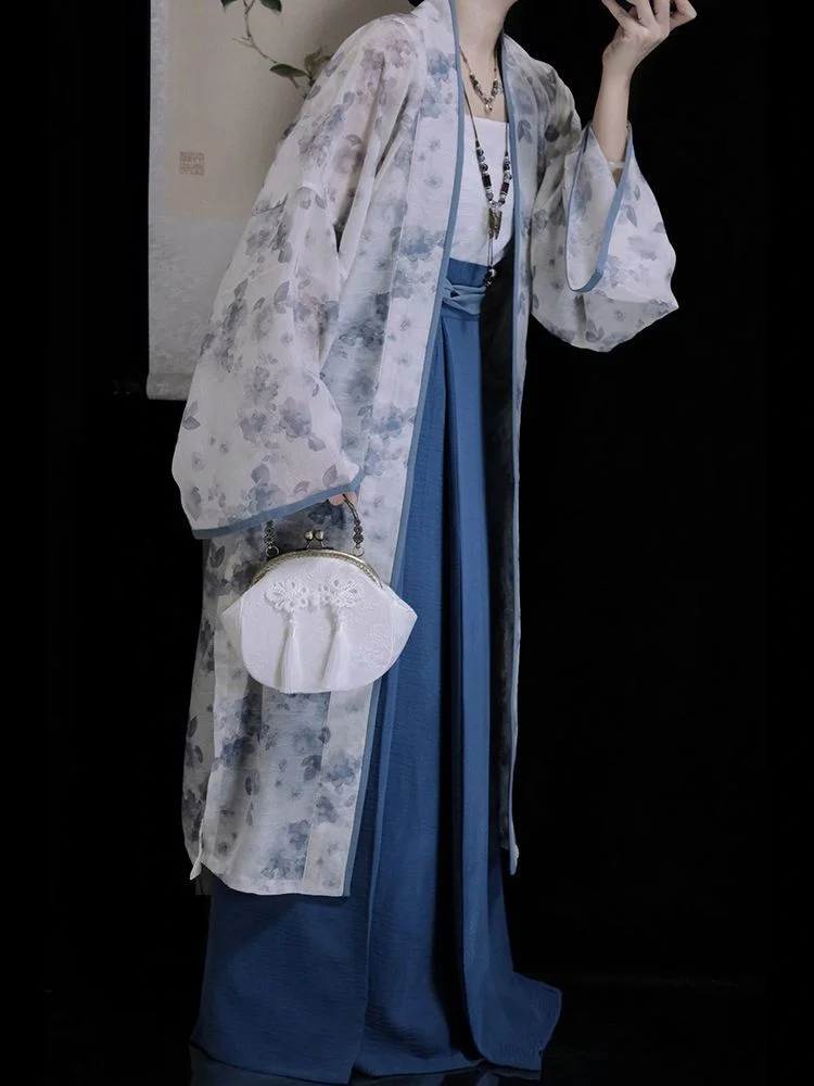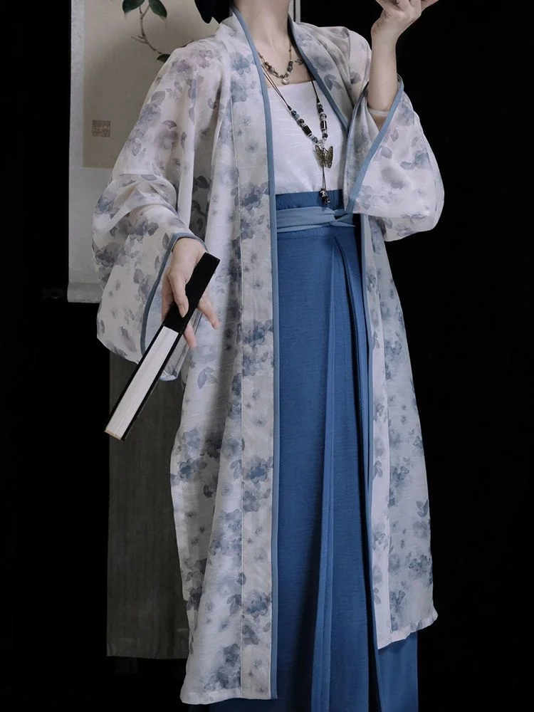 Vintage Traditional Hanfu Women's Summer New Han Elements New Chinese Style Modern Long Print Cardigan + Dress Two Piece Set
