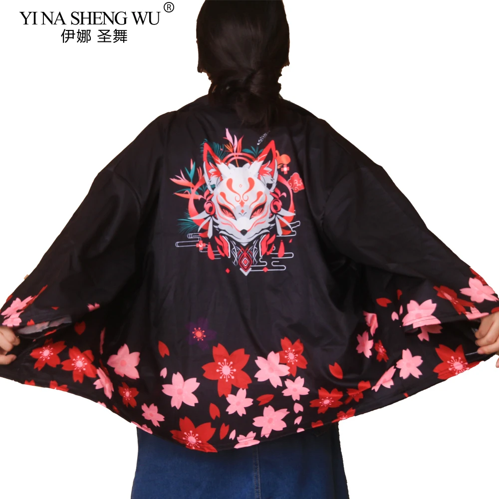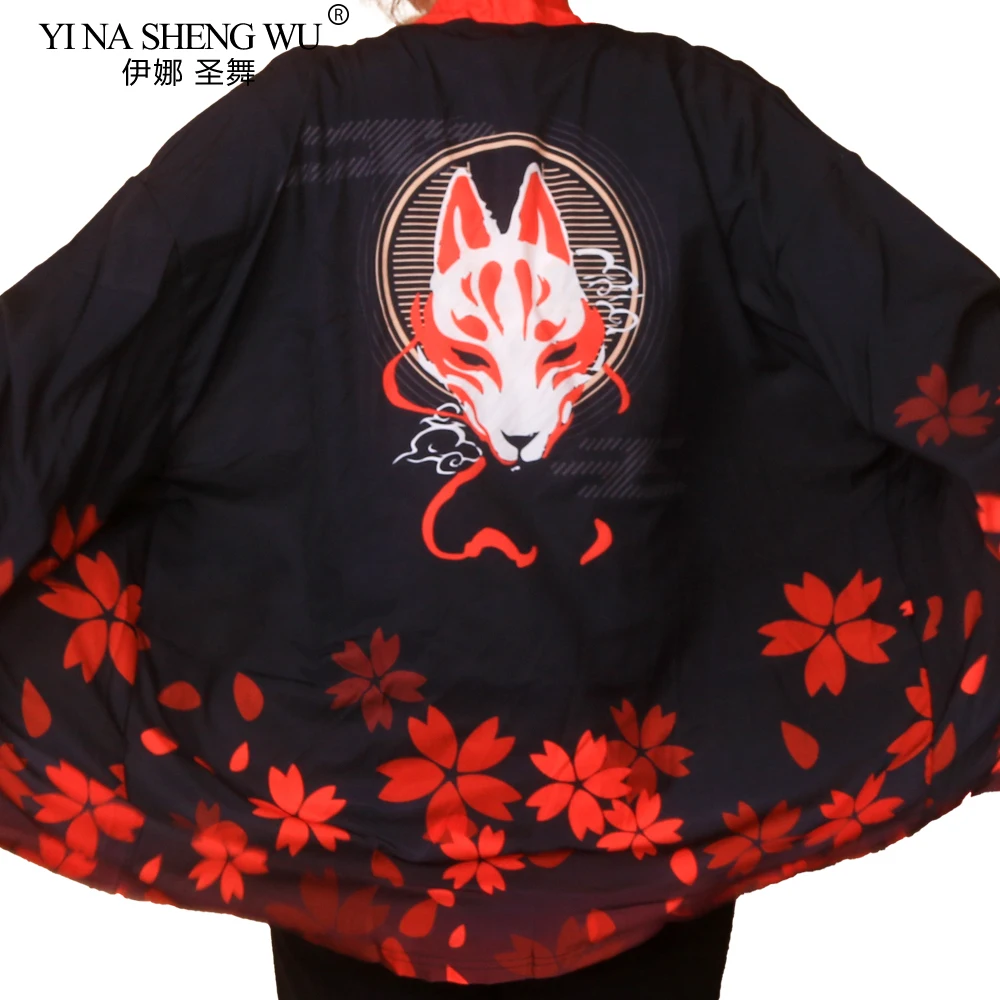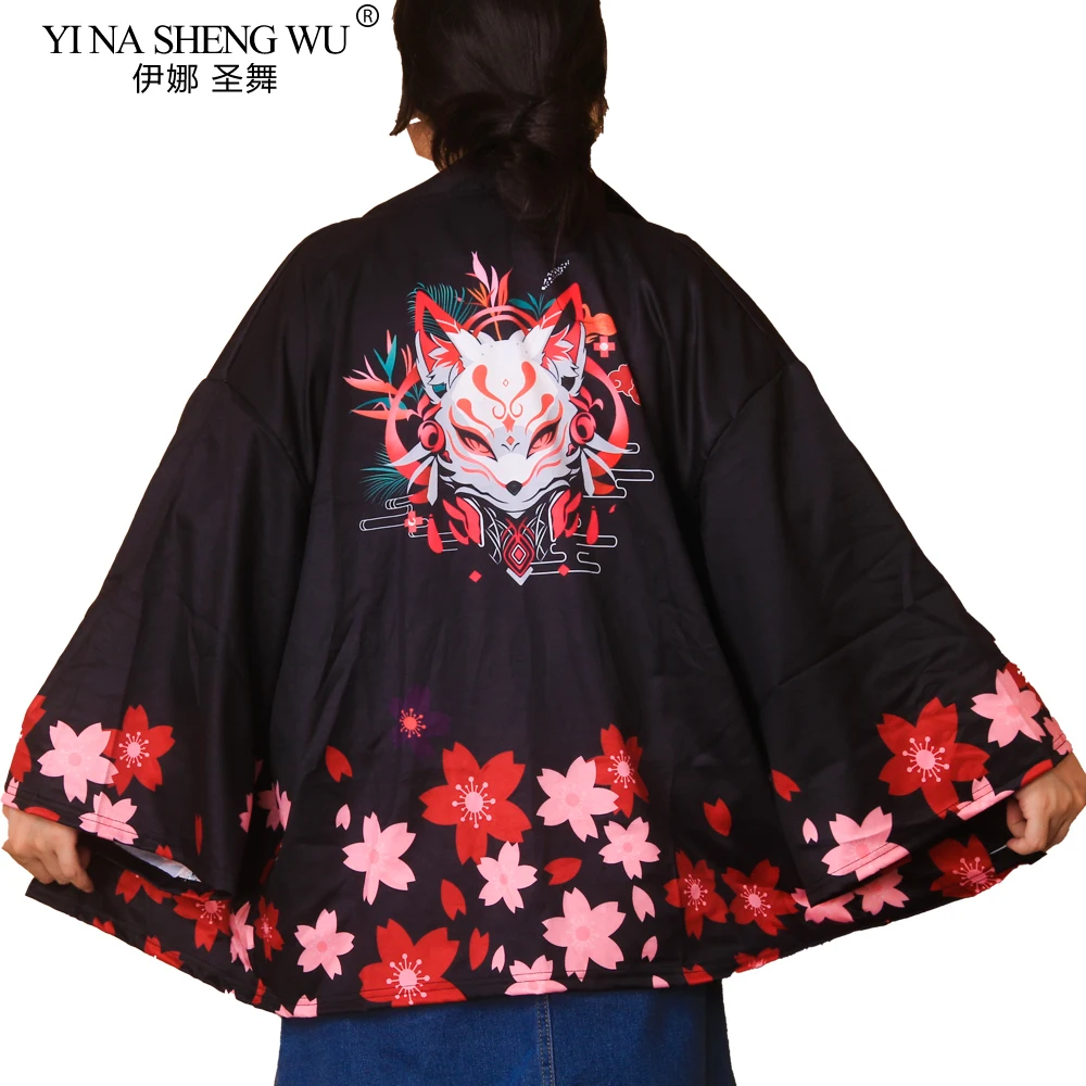 Fox Mask Print Coat Japanese Kimono Cardigan Shirt Women Haori Yukata Cosplay Men Traditional Clothing One Size