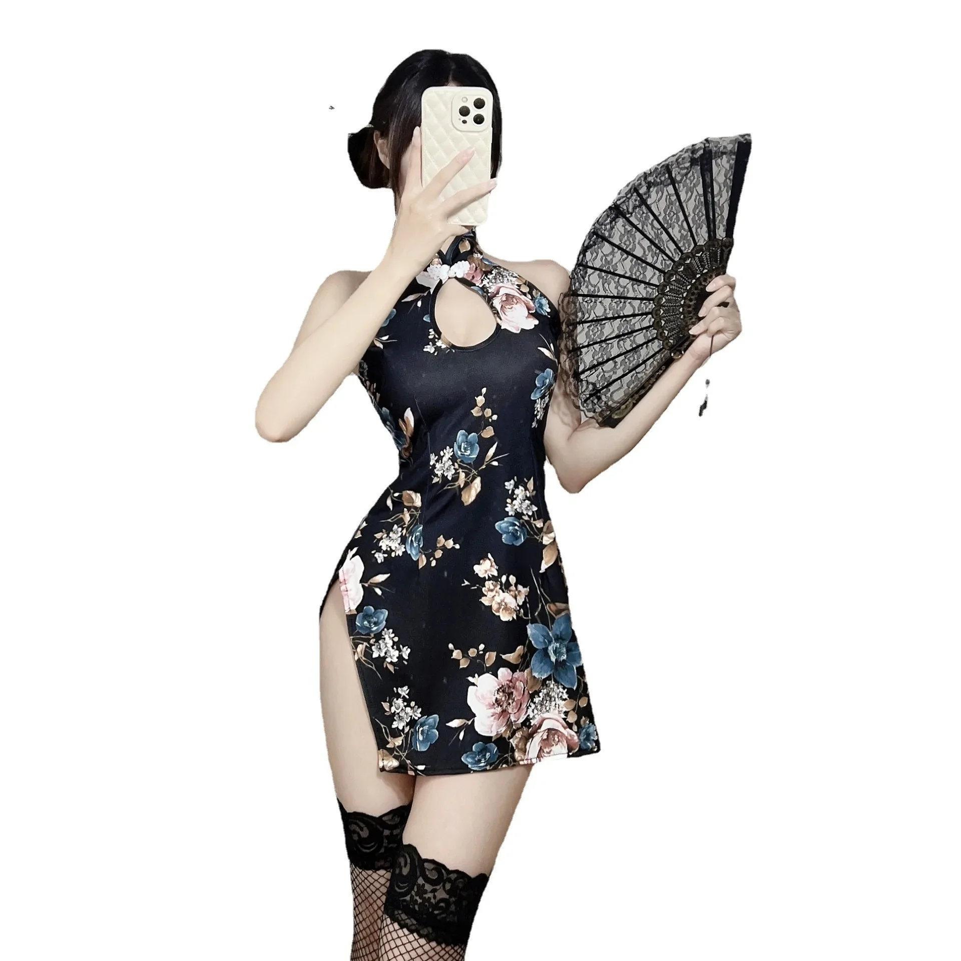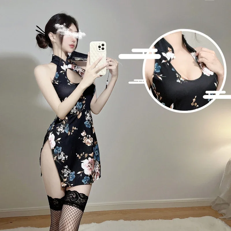 Retro Chinese Cheongsam Uniform Women Embroidered Transparent Cosplay Sexy Lingerie Pornos See Through Mini Qipao Dress Costumes