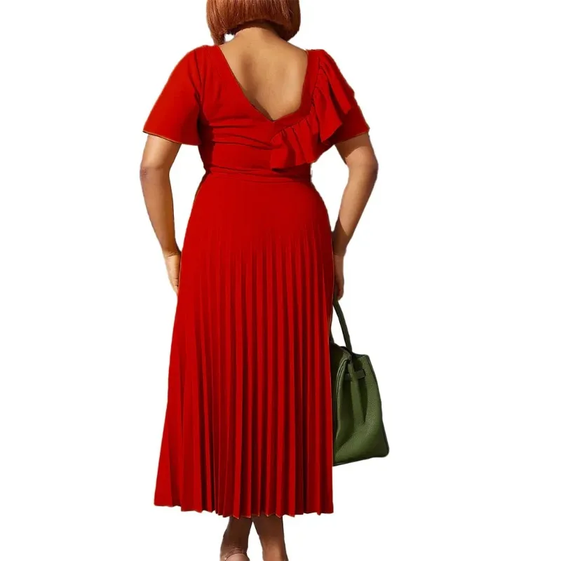 2024 Red African Dresses for Women Elegant Short Sleeve V-neck Pleat Party Evening Long Maxi Dress Dashiki Africa Clothing