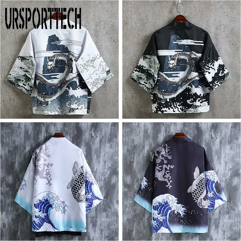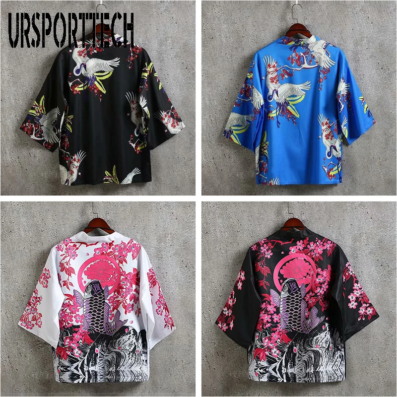 URSPORTTECH Mens Kimono Cardigan Japanese Carp Print Loose Shirt Tops Summer Casual Woman Man Kimonos Coat Couple Yukata Kimonos