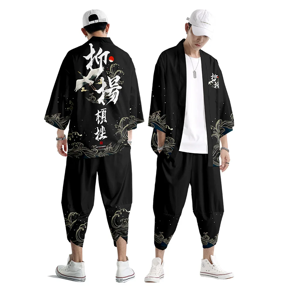 Two-piece Suit Astronaut Print Oversize Japanese Style Fashion Kimono And Pants Set Men Cardigan Blouse Haori Obi Asian Clothe