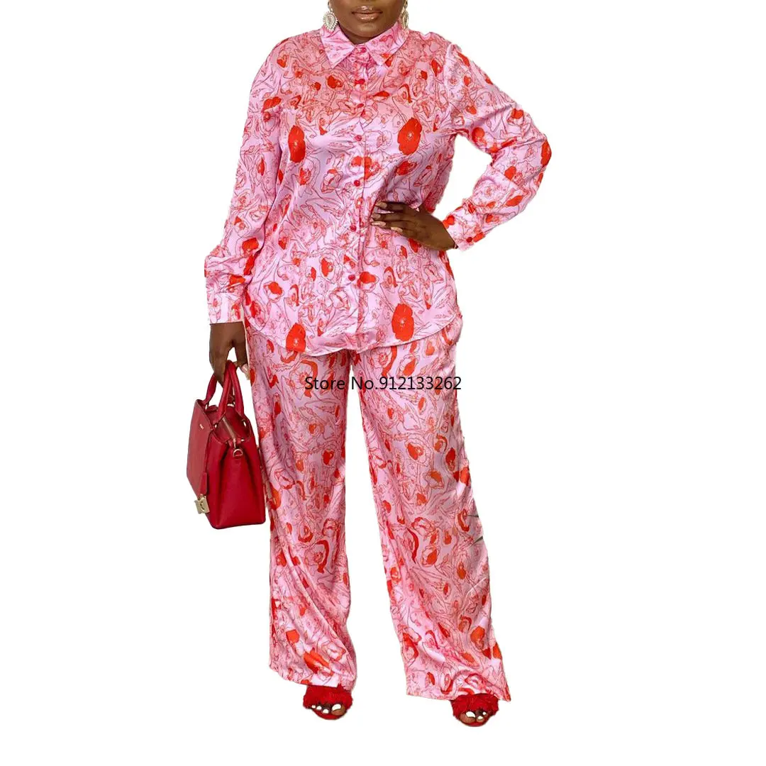 Elegant set for Women pink print High Waisted V Neck Fashion Luxury Evening Night Club Overalls Top and Long Pant