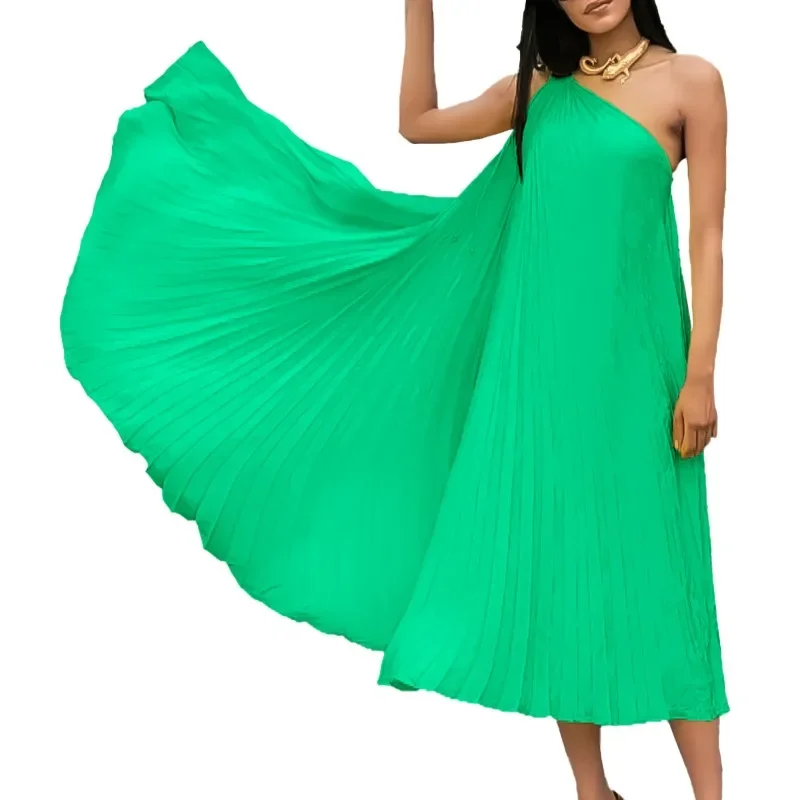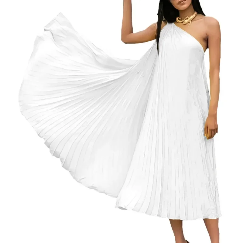 Fashion Women One Shoulder Pleated Sleeveless Big Swing Straight Dress 2024 Vintage Party Cocktail Evening Dresses