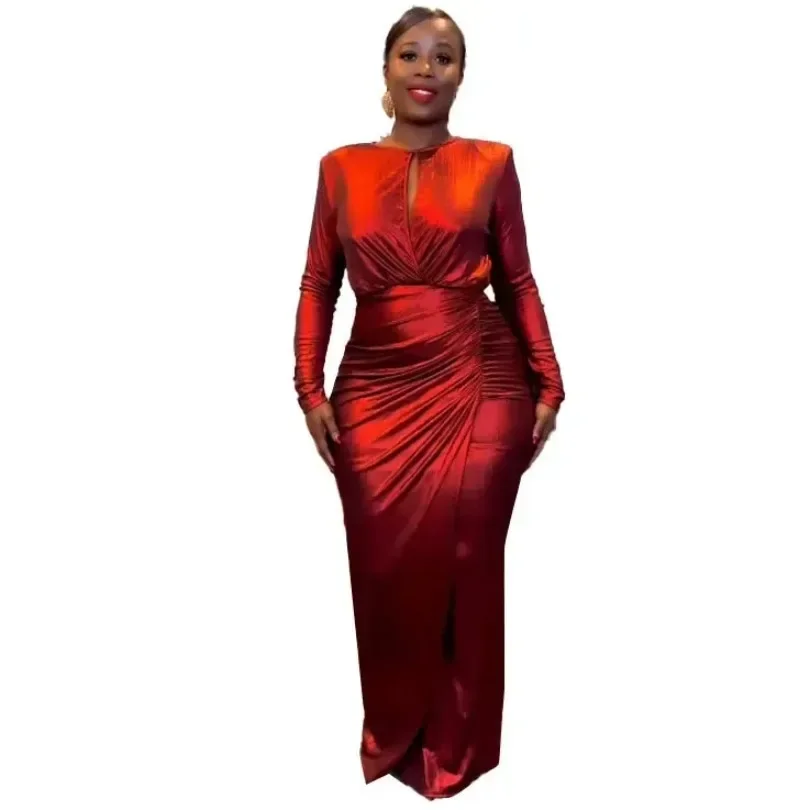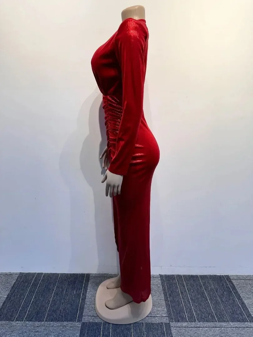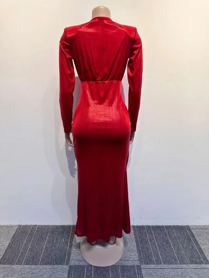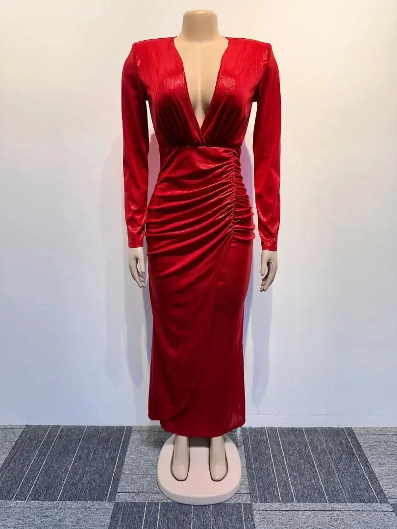 Name | Women Solid Slim Fit Pleated Slit Dress Spring Autumn Elegant Party Formal Dress Women Sexy Long Sleeve V-neck High Waist Dress |