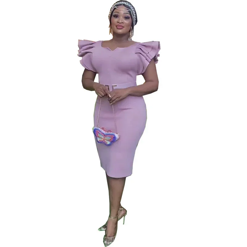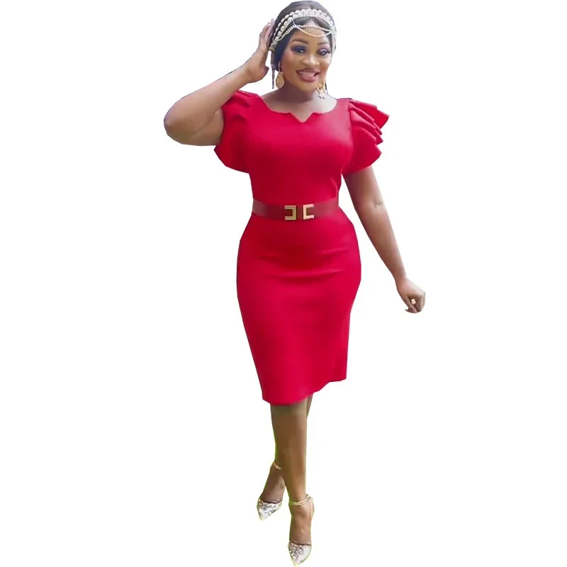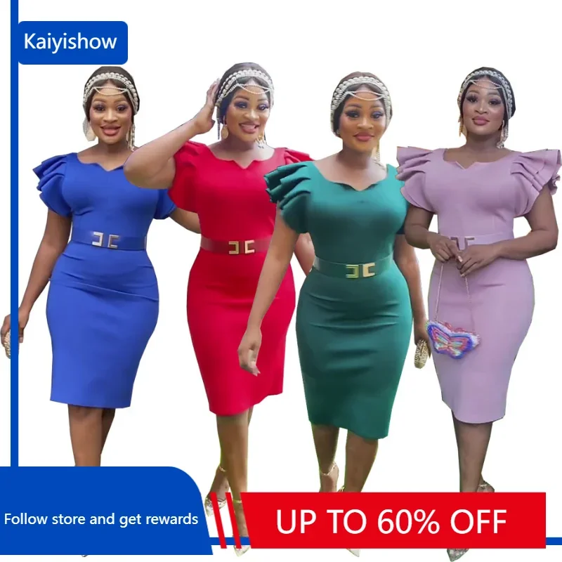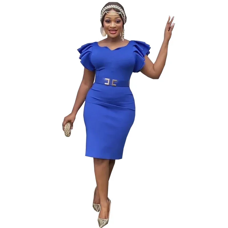 African Sheath Pencil Dress For Women 2023 Fashion Ruffle Sleeve High Waist Hip Wrap Belt Work Office Lady Bodycon Party Dresses