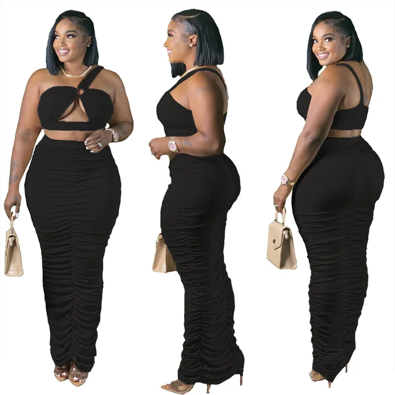 2 Piece Set Women Clothing Crop Top And Long Skirt Two Piece Set Solid Color Pleated Chic Design Hollow Steel Ring Sexy Outfits