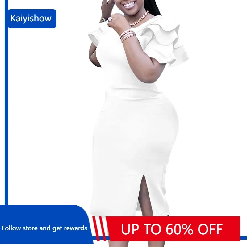 Elegant Bodycon Dresses for Women Square Neck Ruffles Sleeve Package Hips Side Split Sexy African Birthday Party Dinner Dress