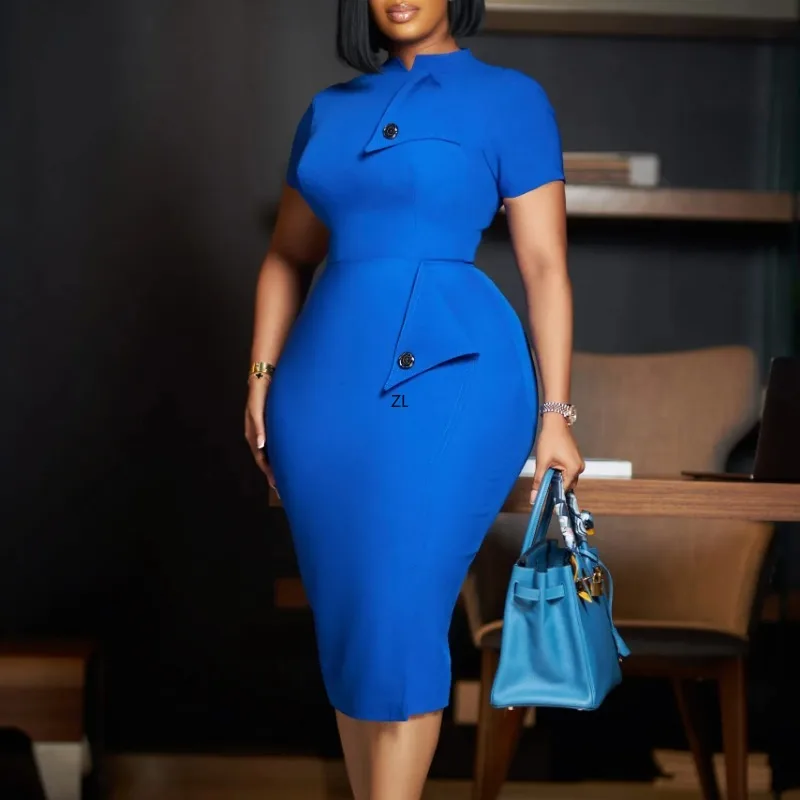 Summer Elegant African Short Sleeve Blue Yellow Red High Waist Polyester Bodycon Dress Africa Clothing African Dresses for Women