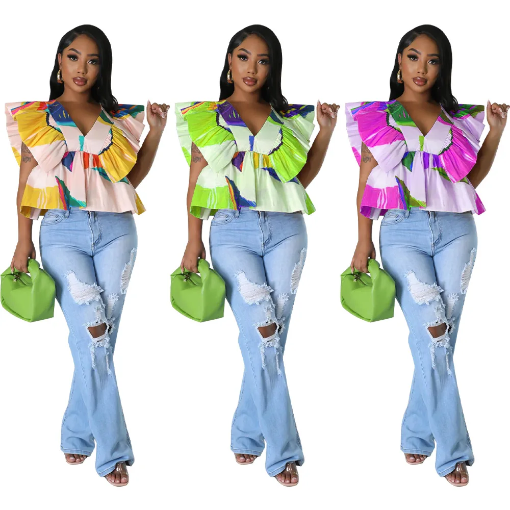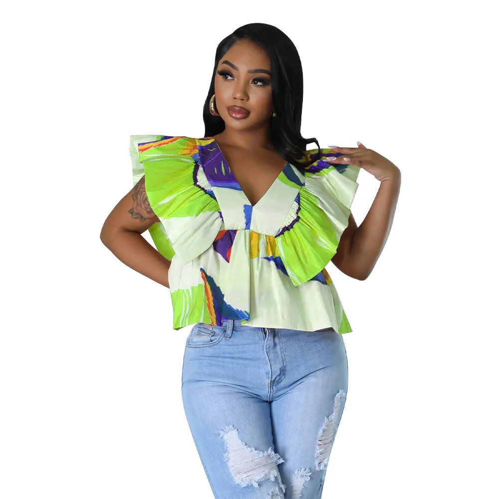 Name | African Clothes for Women Summer African Printing Ruffles Short Sleeve V-neck Blouse Elegant Women Tops African Clothing |