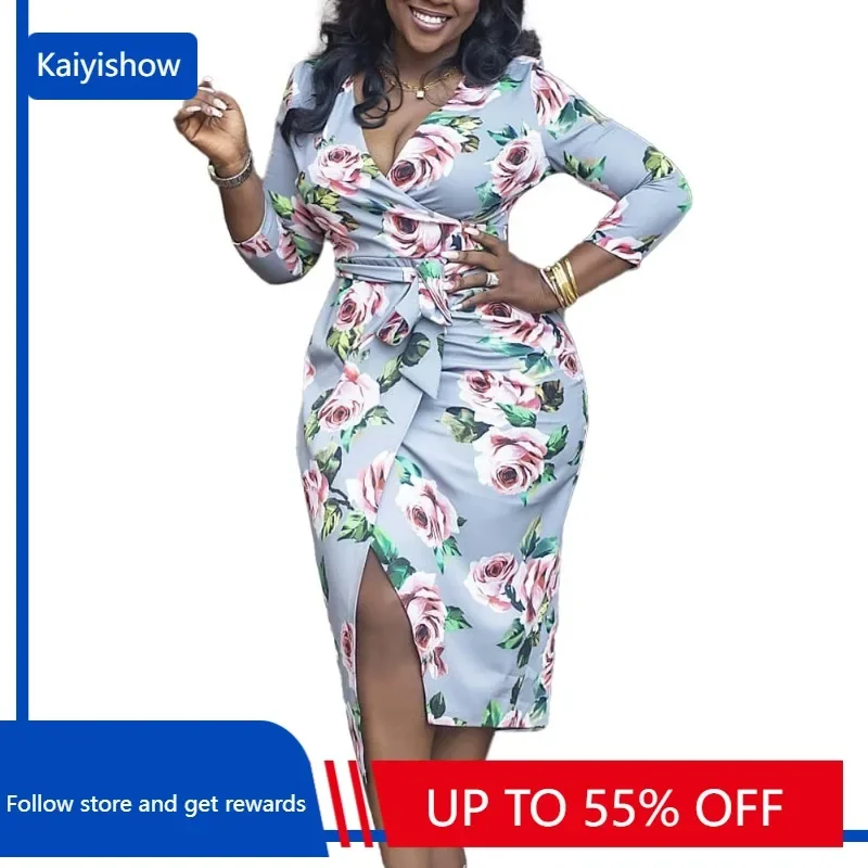 Plus Size Spring Summer New V-Neck 3/4 Sleeve Printed Lace Up Wrap Hip Commuting Style Slim Fit Mid Length High Waist Dress