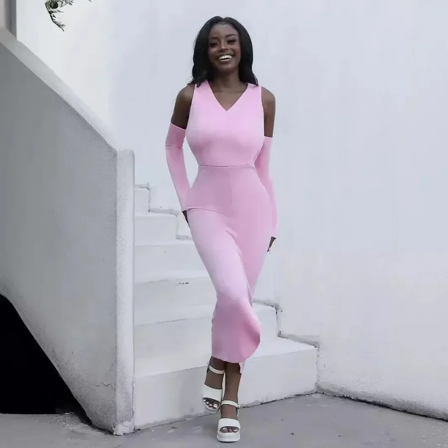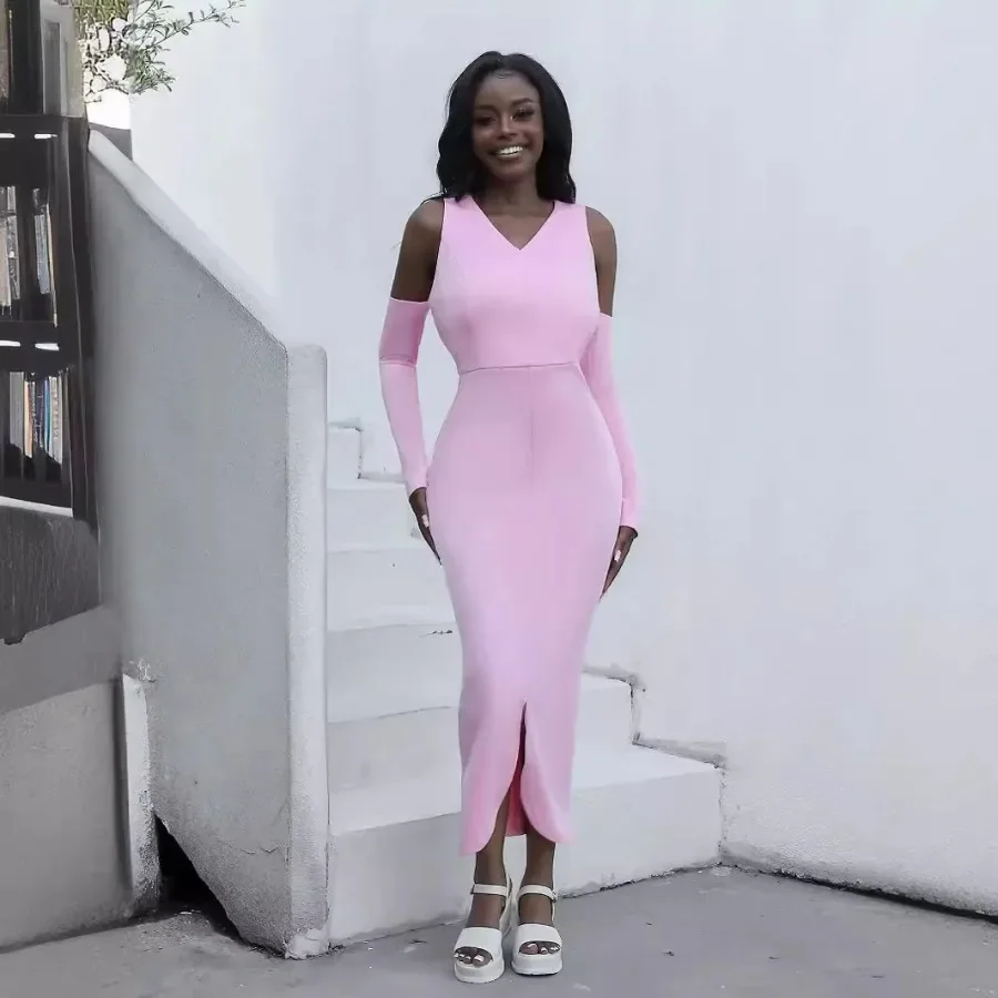 Elegant African Dresses for Women Summer 2024 Africa Women Long Sleeve V-neck Pink Bodycon Dress Long Maxi Dress Africa Clothing