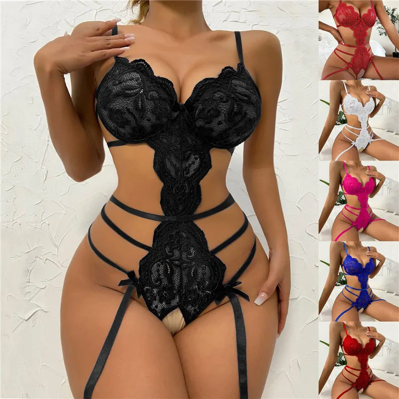 Sexy Crotchless Teddy Baby Doll Dress Deep V Open Bra Porn Underwear Set New Lingerie Women Lace Hollow Bra Set Erotic Costumes