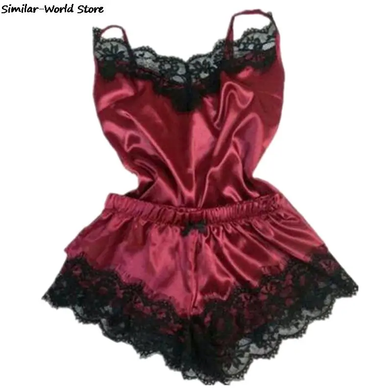 Fashion Women Pajamas Women Sleepwear Sleeveless Strap Nightwear Lace Trim Satin Cami Top Pajama Sets Sexy Hot Erotic Home Wear
