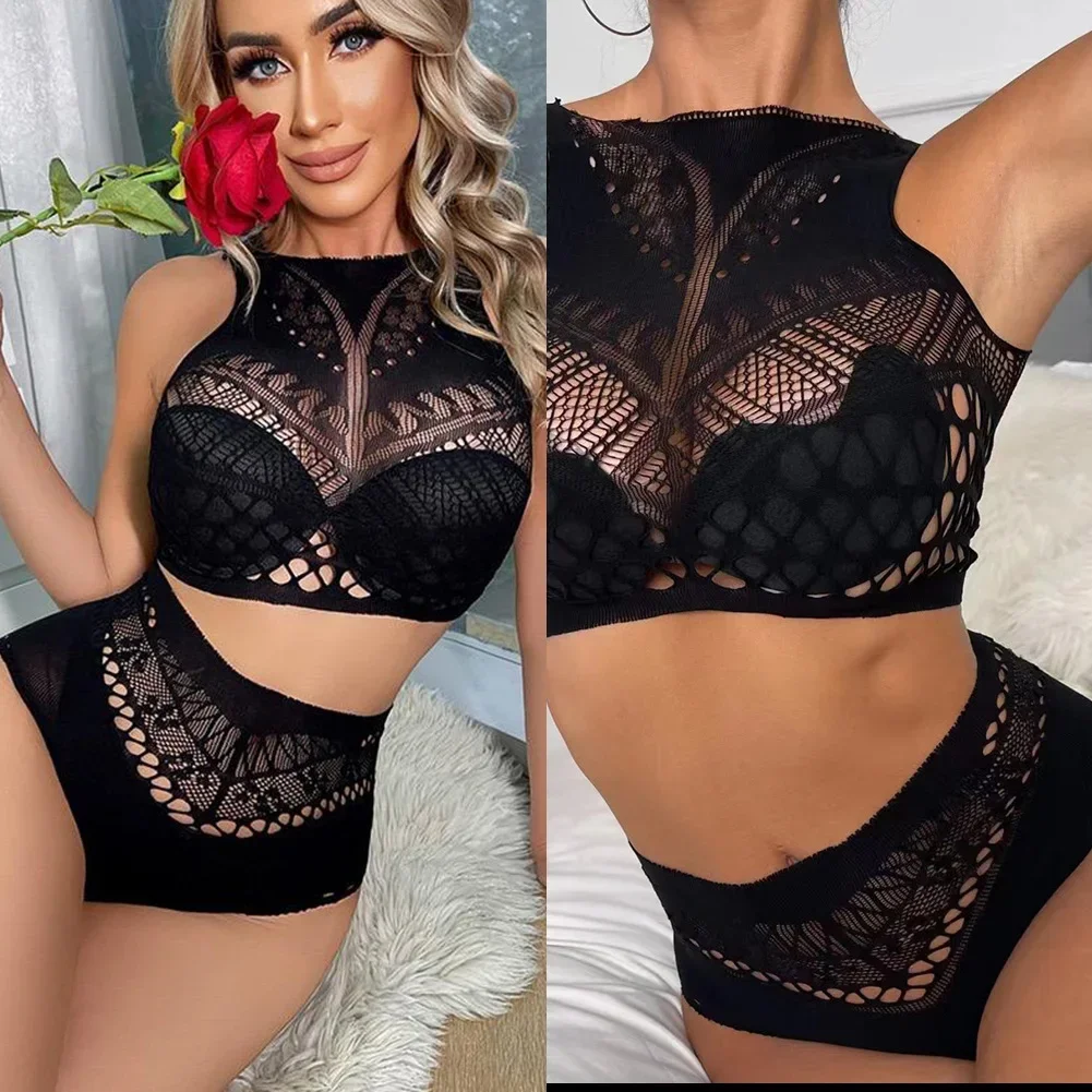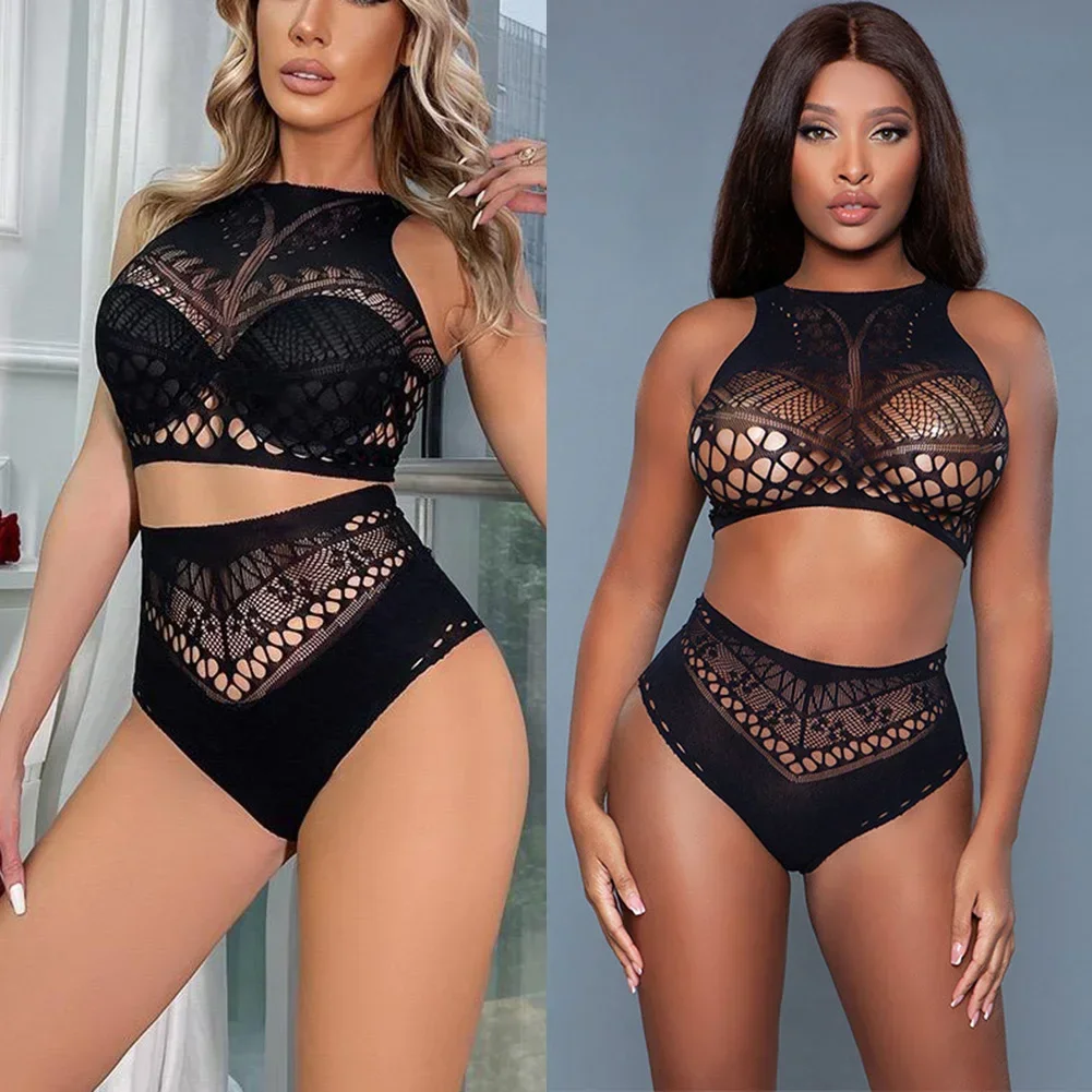 Sexy Lingerie Women Fishnet Two-Piece Suit Bra Panty Temptation Uniform Black Girl Wear Top Body Stocking Lingerie