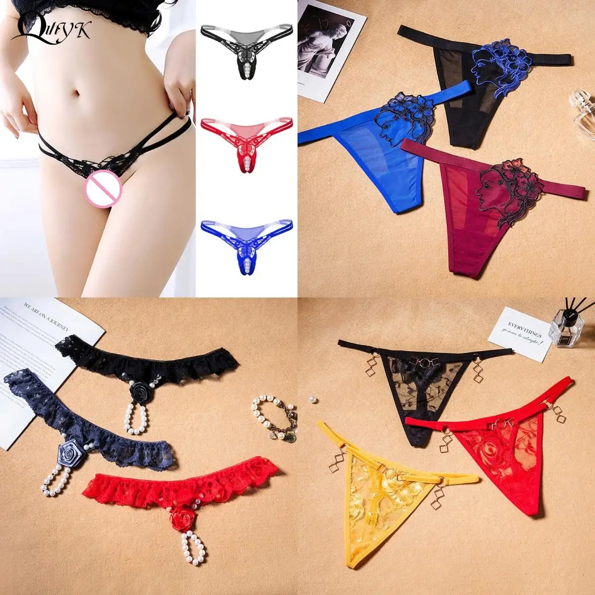 Sexy String Lace Underwear Women Back Bow Panties Women G String T-back Thong Transparent Lingerie Cute With Pearls Panties
