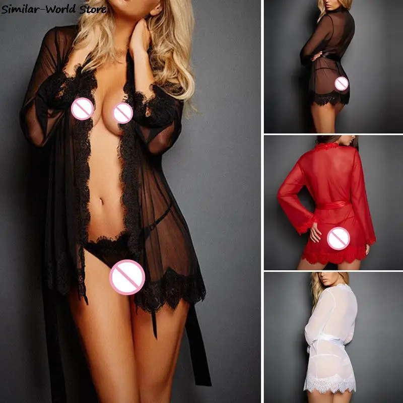 Sexy Lace Nightwear Erotic Lingerie Sleepwear Women Summer See Through Sleep Dress Solid Lace Pajamas Bath Robe Dress Nightgown
