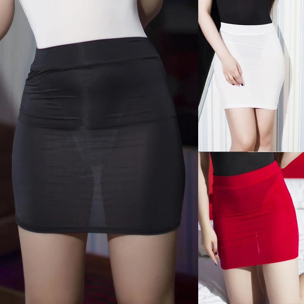 Women Sexy Skirt Oil Shiny Solid Lingerie See Through Bodycon Party Clubwear Wrap-around Skirt Thin Breathable Nightwear