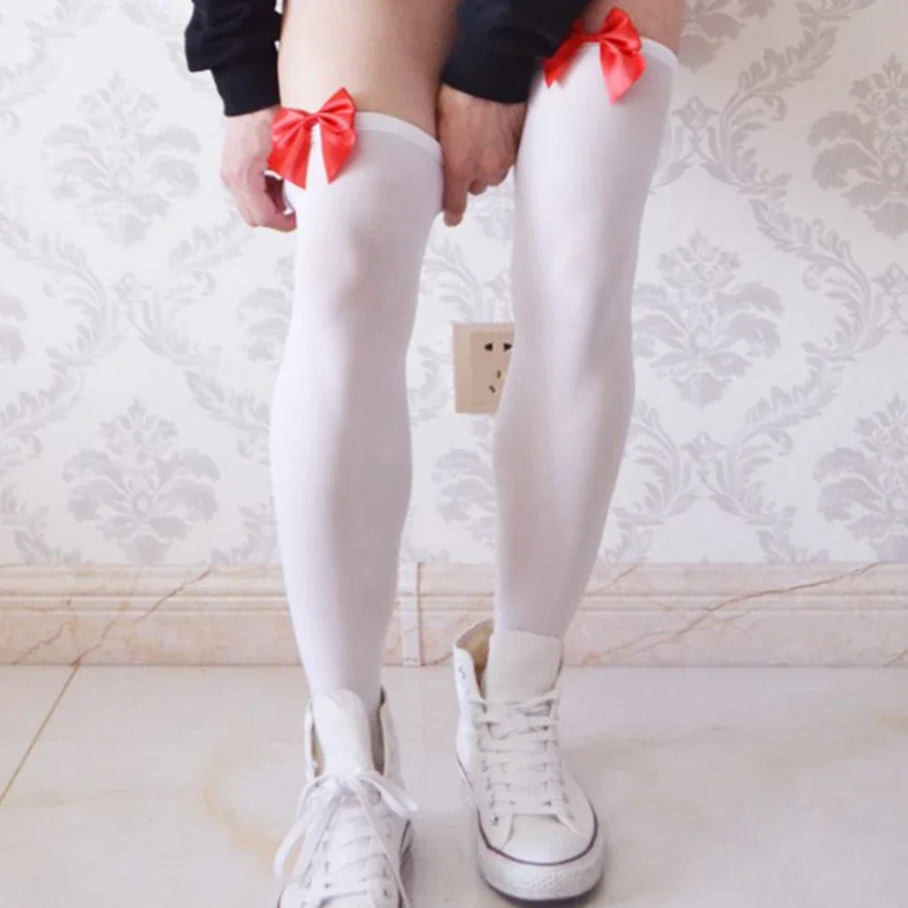 Men Sissy High Stockings Elastic Thigh Sport Training Pantyhose Over Knee Bowknot Socks Gay Man Dance Clubwear Erotic Lingerie