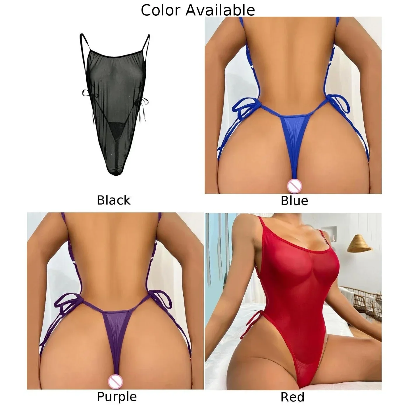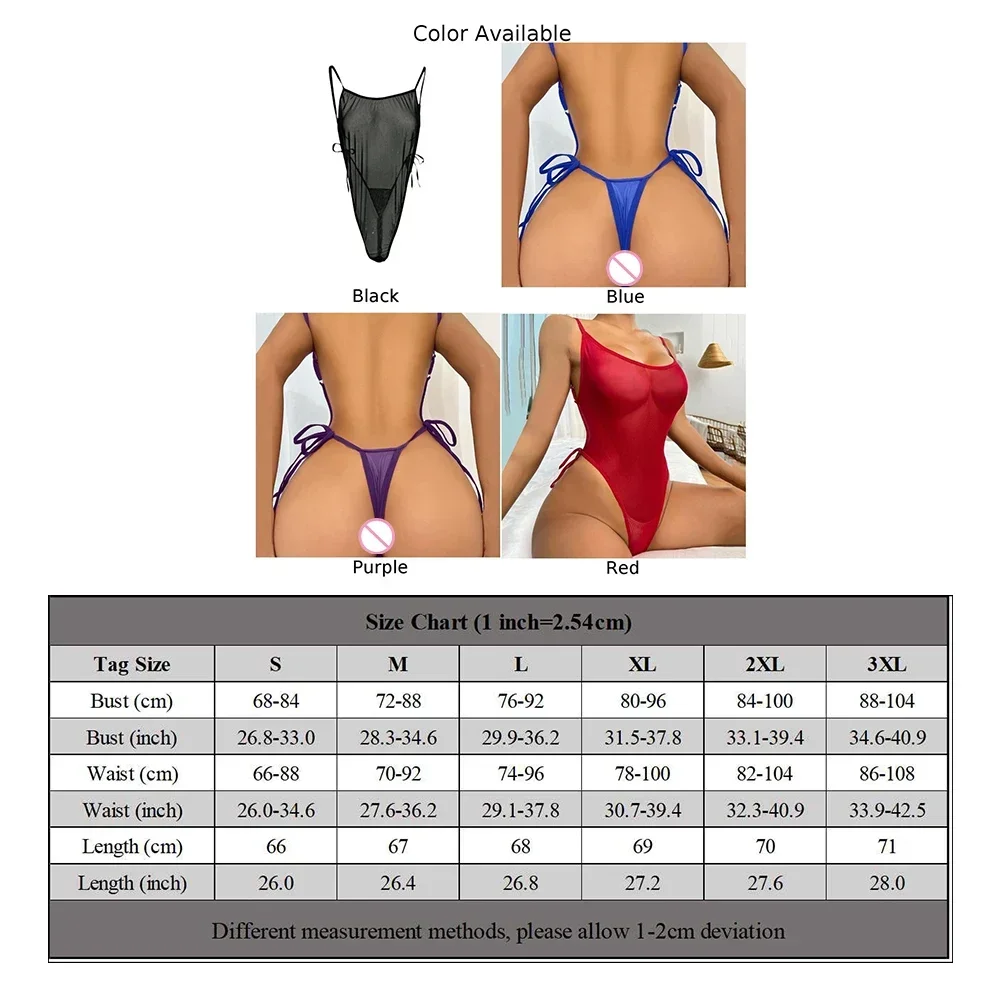 Women Sexy Sheer Mesh Transparent Bodysuit Thin Straps Backless Lace-up Leotard High Cut Jumpsuit Seductive Lingerie Pajamas