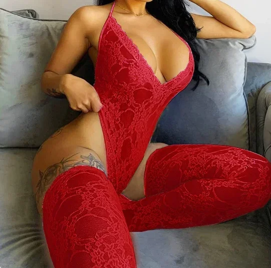 Women's Sexy Lace Bodysuit Sleeveless See-through Backless Deep V-neck Skinny Halter Jumpsuit with Socks Female New Style