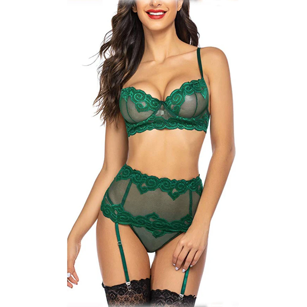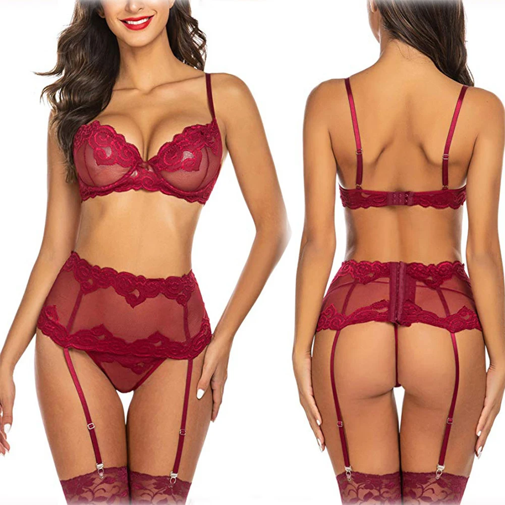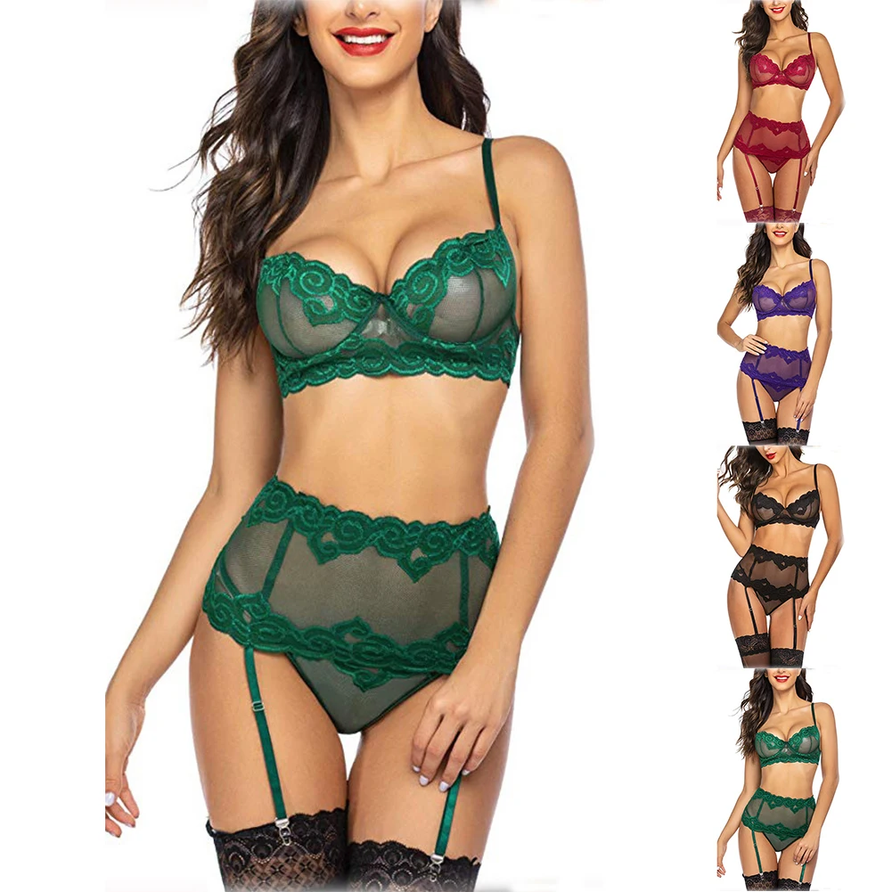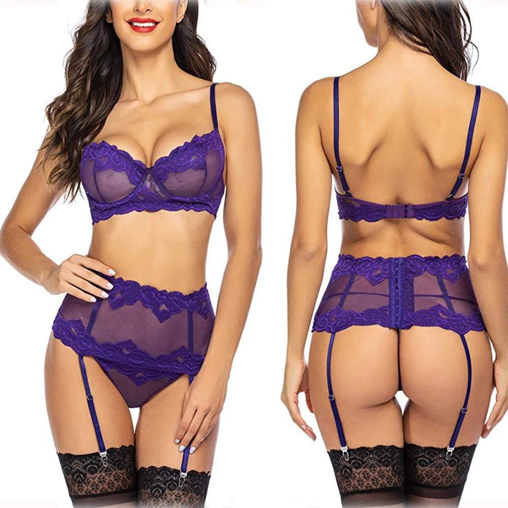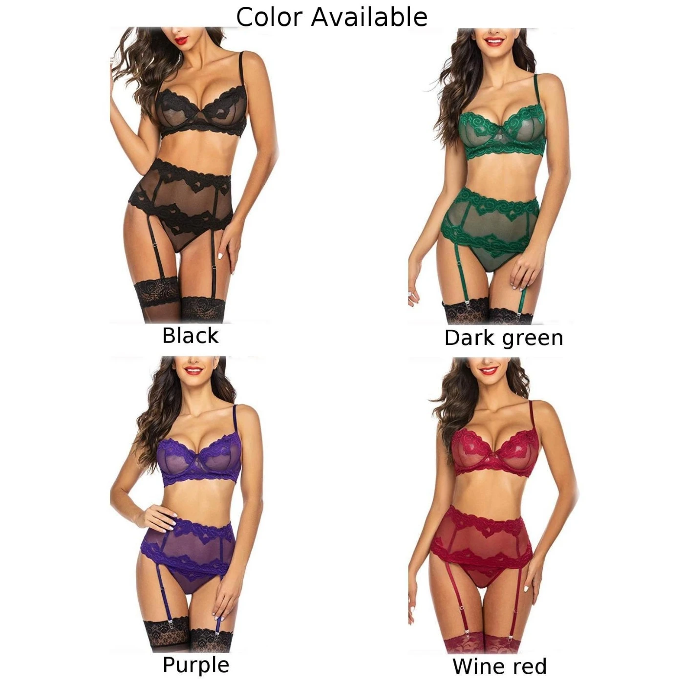 Women Sexy Lace Lingerie Sets Bra G-string Thong Suspender Garter Belt Suit 3PCS Nightwear See-through Erotic Lingerie Clubwear
