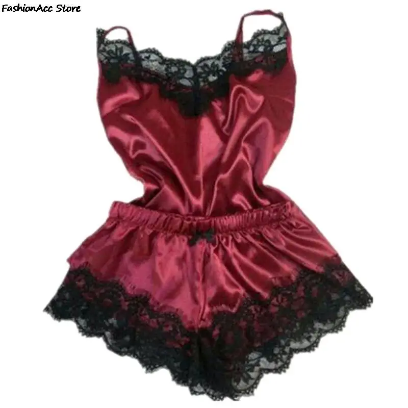Fashion Women Pajamas Women Sleepwear Sleeveless Strap Nightwear Lace Trim Satin Cami Top Pajama Sets Sexy Hot Erotic Home Wear