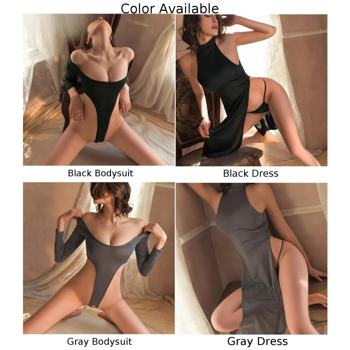 Sexy Women High Slit Bodycon Erotic Dress Crotchless Long-Sleeve Bodysuit Elastic Sheer See Through Party Clubwear Nightwear