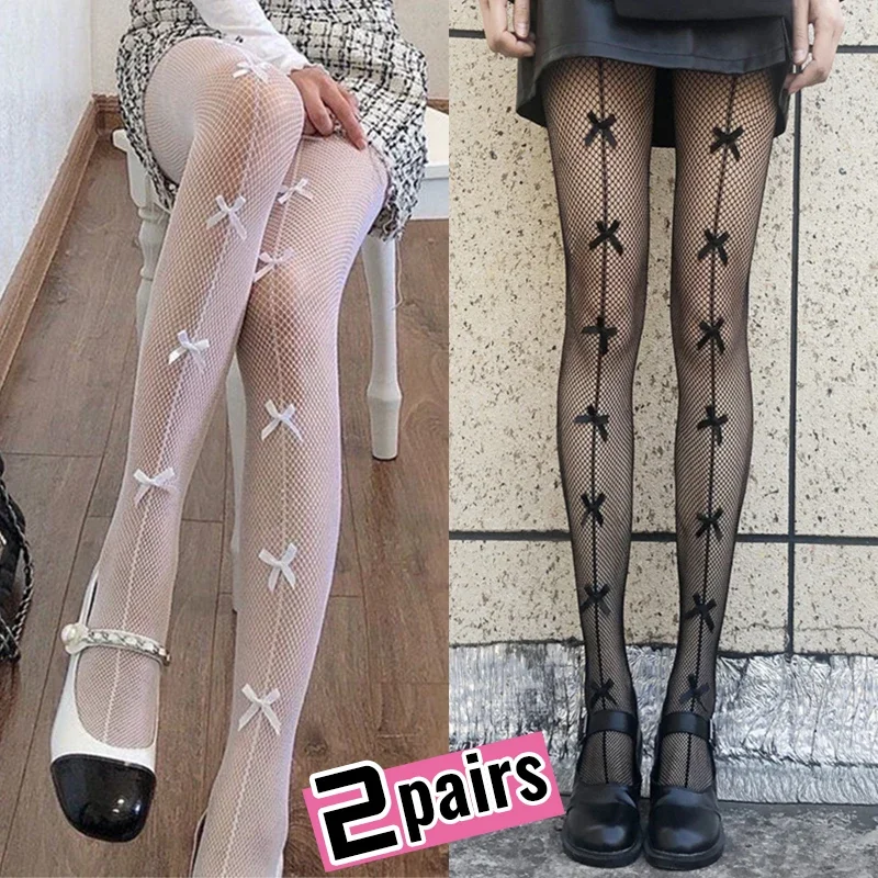 Sexy Lolita Bow Stockings Women Transparent Mesh Fish Net Long Socks Punk JK Black White Slimming Pantyhose Female Tight Legging