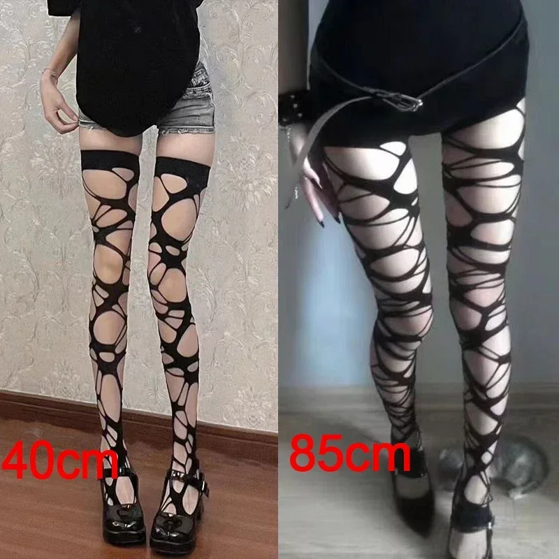 Women Punk Style Pantyhose Girlfriend Hole Bodystockings Sexy Torn Strap Gothic Thigh Knee Socks Ragged Female Thigh High Tights