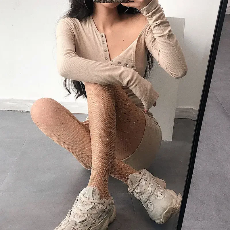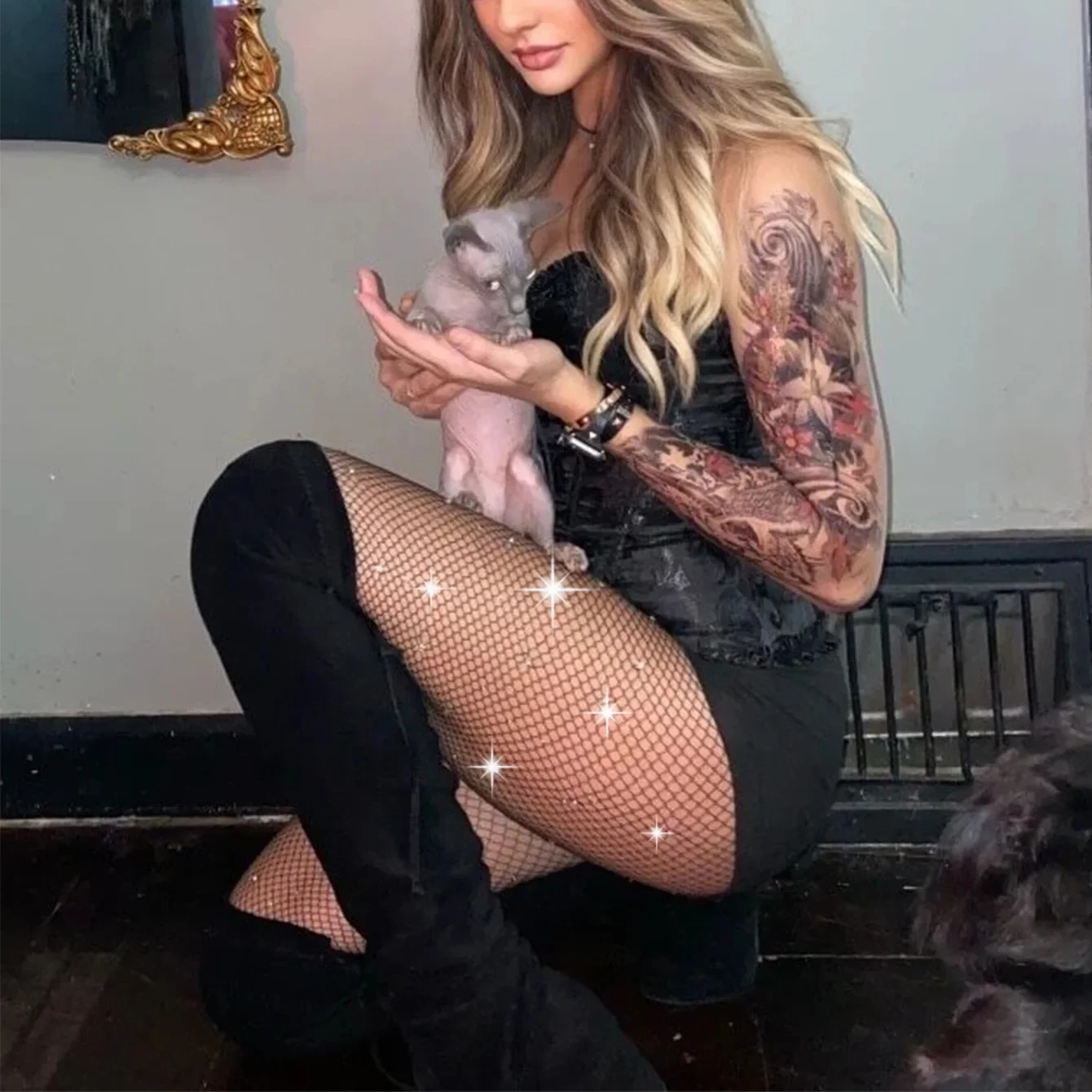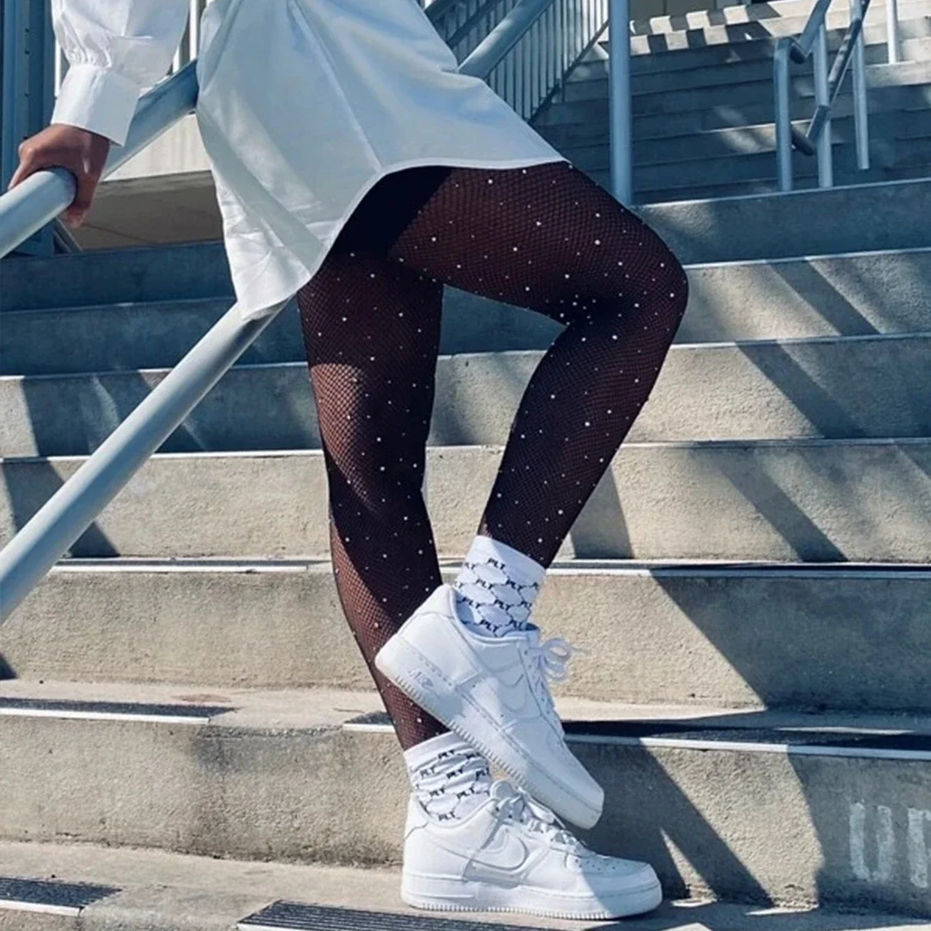 Women Mesh Fishnet Stockings Black Pantyhose Rhinestone Shiny Thigh High Long Tights Lingerie Sexy Hot Bling Nightwear Tights