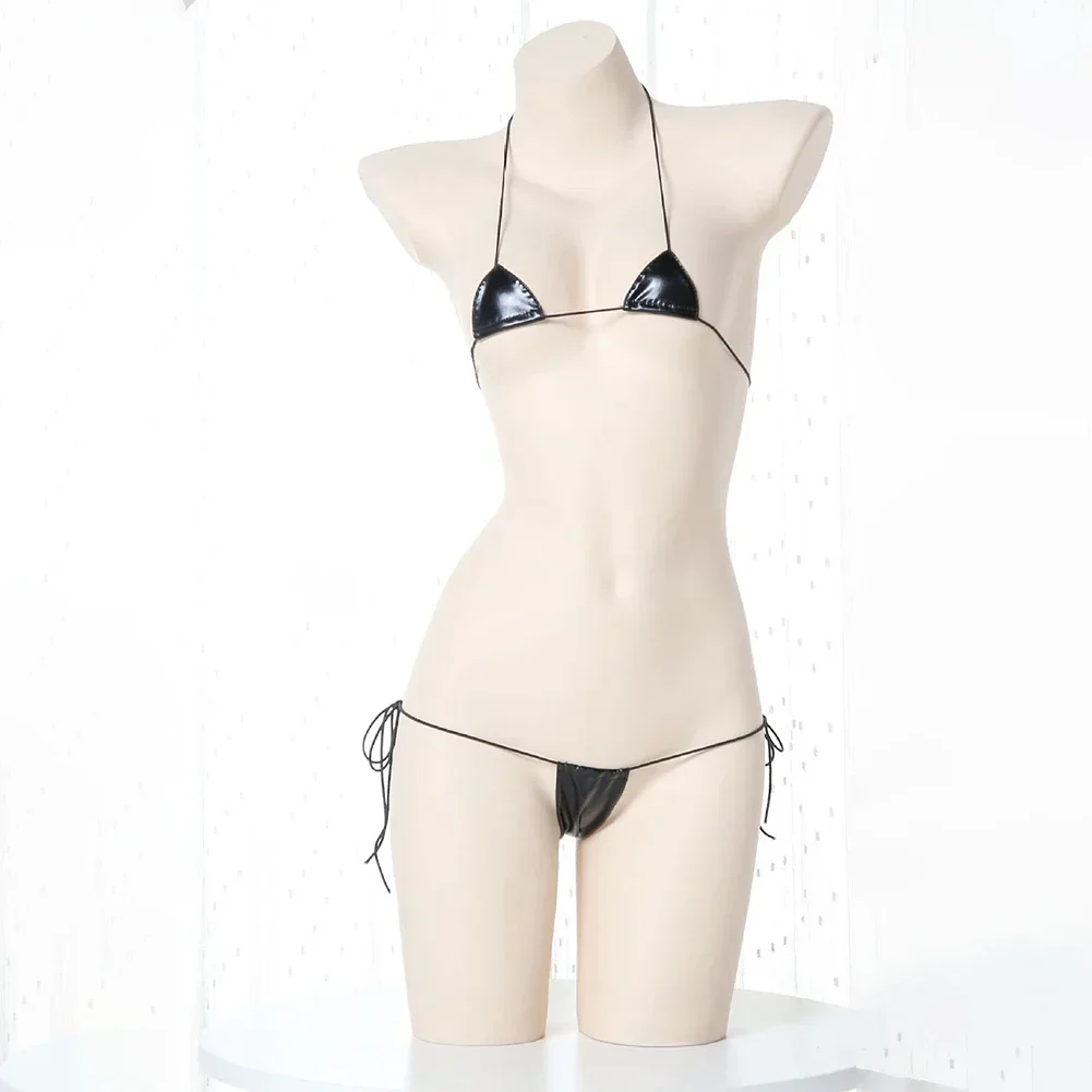 2pcs Women's Sexy Lingerie Bras G-strings Set Wet Look Patent Leather Halter Lace-up Swimwear Female Bikini Underwear